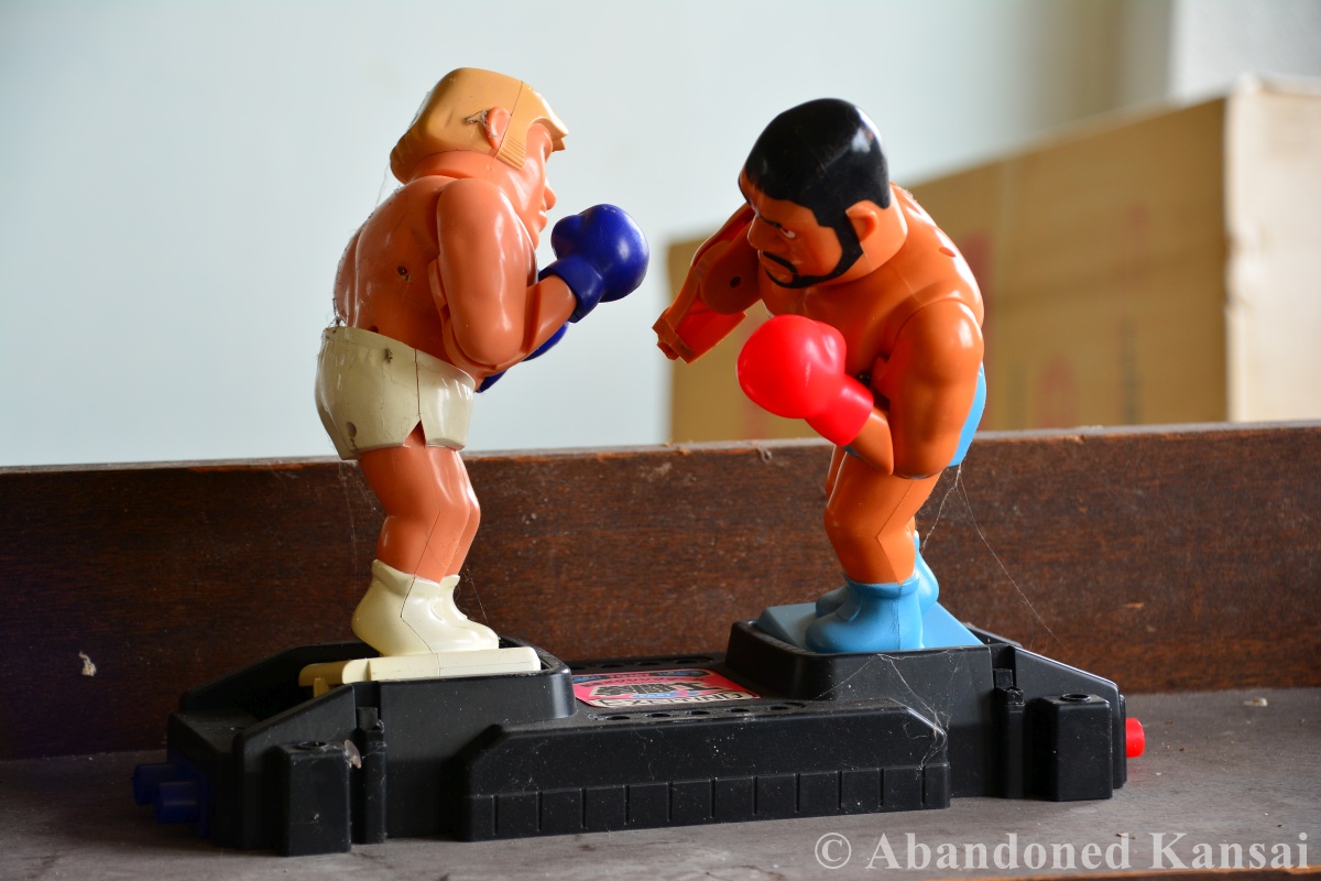 The Black Mirror Hotel was actually a rather small, completely trashed, run-of-the-mill abandoned hotel in the outskirts of a large city in Hokkaido, 4 kilometers away from the next train station, no bus stop nearby. It is absolutely beyond me why anybody would build accommodation like that… or why anybody would stay there. Upon entering I also wondered why anybody would explore the place, because at first sight it really was the worst kind of abandoned places there is, combining pretty much everything I dislike about urbex. But we made it all the way to central Hokkaido, so we could as well have a closer look. Trash, vandalism, mold. Misery within seconds. Towards the end of the trip or late in the afternoon instead of early in the morning, first location of the day actually, I probably would have left after a few minutes, but… again… we traveled all the way to central Hokkaido. On the ground floor I found one of those mechanical boxing toys – one of the figures looked like an in-shape version of the orange peril, who had just become president for the first time and was years away from bombing girls’ schools in Iran, so I had a giggle about that.