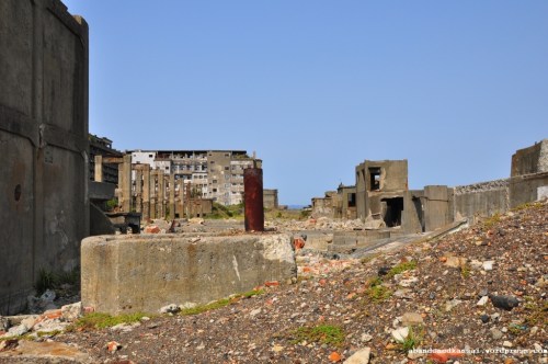 Gunkanjima » Between The Boat And The First Gathering Area – View To The North At The School Along The Former Conveyor Belt