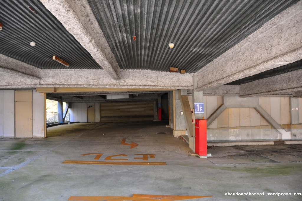 The Eastern Parking Lot is easy to find as it is part of the main entrance – most of the people entering Nara Dreamland when it was still open passed through here. There are two ways to enter the area and both involve just stepping over a rope; no fence, no gate, no nothing; but a guard showing up once in a while on a scooter. Coming from the east you’ll see the former pay booths for the parking lot, with the phones and stools still in place. The main entrance is now right in front of you and to your right there is a white building with shutters down (it seems like it was closed down even before the rest of the park was, judging by the pictures I saw on the net) and a the Parking Garage – opposite of that building complex are a small building with windows, I guess it was a souvenir shop once, and a huge building that will be the topic of the next blog entry…