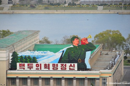 North Korea – Pyongyang, Grand People’s Study House » Huge Sign At A Rooftop At Kim Il-sung Square
