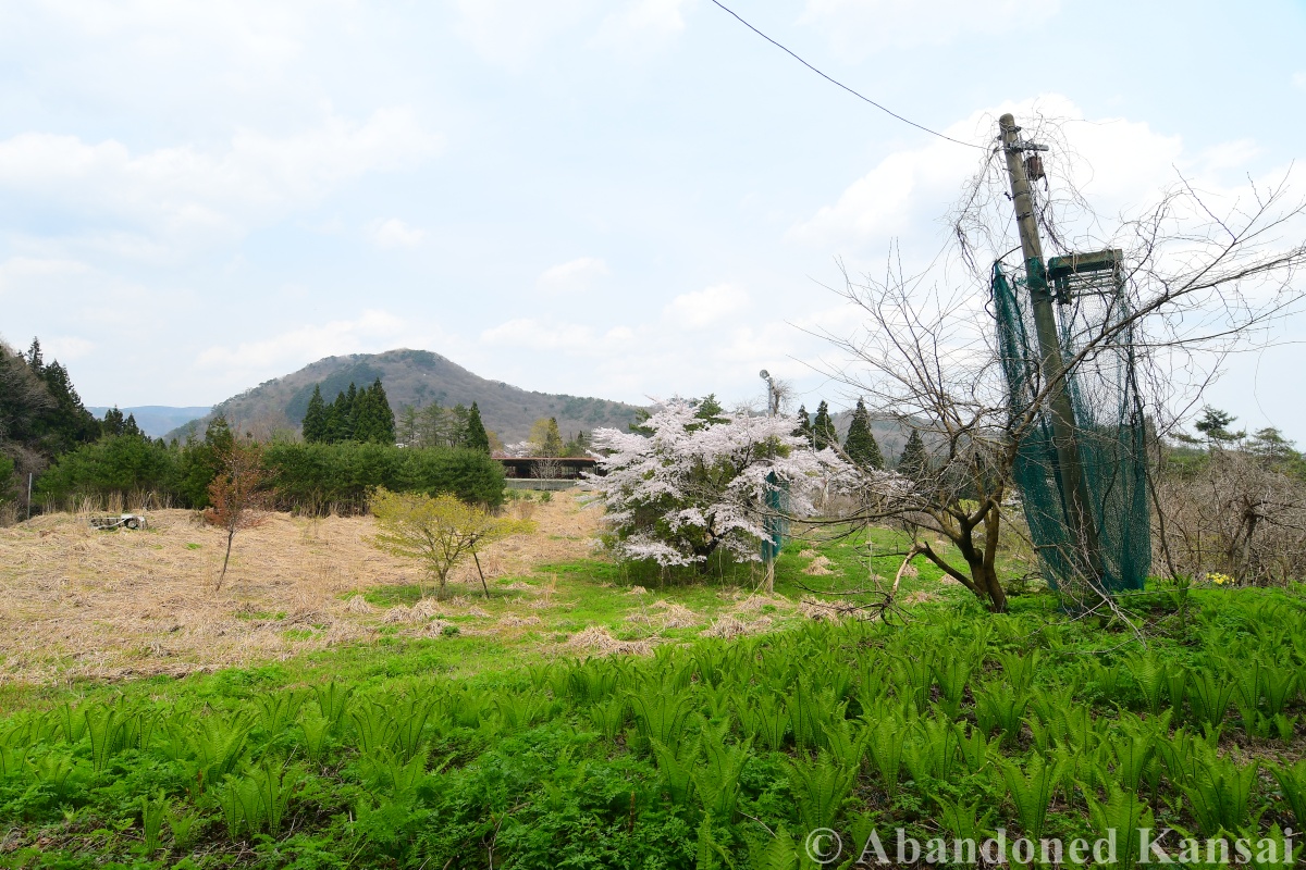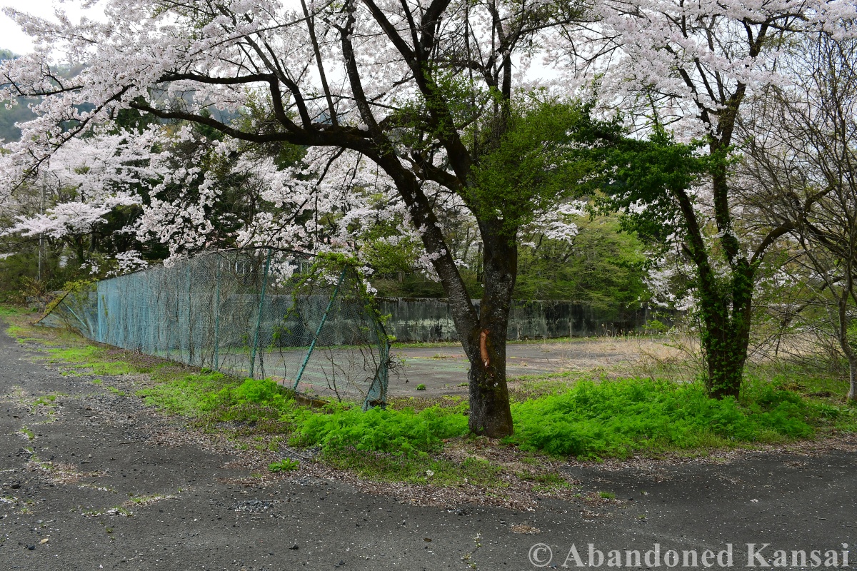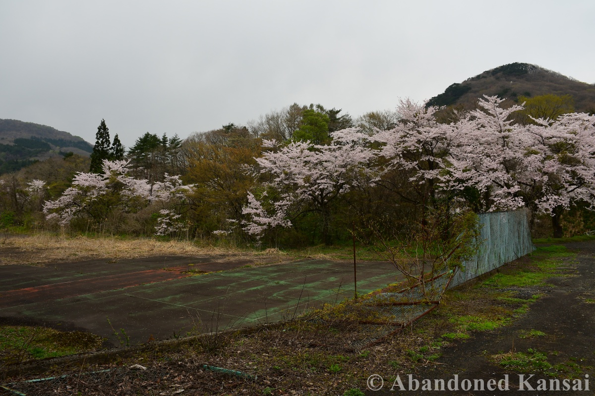 Back at the parking lot I had the choice between backtracking (the safe choice, considering bears and the scarcity of buses in that part of Japan) and trying to find a way down the mountain along whatever path once lead up there. Since my noob brain part acted up earlier, my urbexer brain part went into punishment mode and looked for an entrance to the parking lot, which appeared to be surrounded by a forest. After a while though I found a road back down, completely covered by leaves from at least a decade or two. Steep, rather slippery, the occasional fallen blocking the way. By the time I reached the foot of the hill I was running out of time, so I took a few quick shots of the sports facilities there (including several tennis courts) before approaching the large onsen that I mentioned earlier, which was now between me and the main road with the bus stop. What if there was no way around? What if some onsen employees would spot me? What… was I doing worrying so much? So I packed my gear and tackled the situation, which could indeed have been a problem (THAT is why I was worrying so much!), but fortunately the gated road lead just past the onsen – and the gate was open with no onsen employees in sight. So off I went to enjoy the last fading cherry blossoms in a much more relaxing environment…