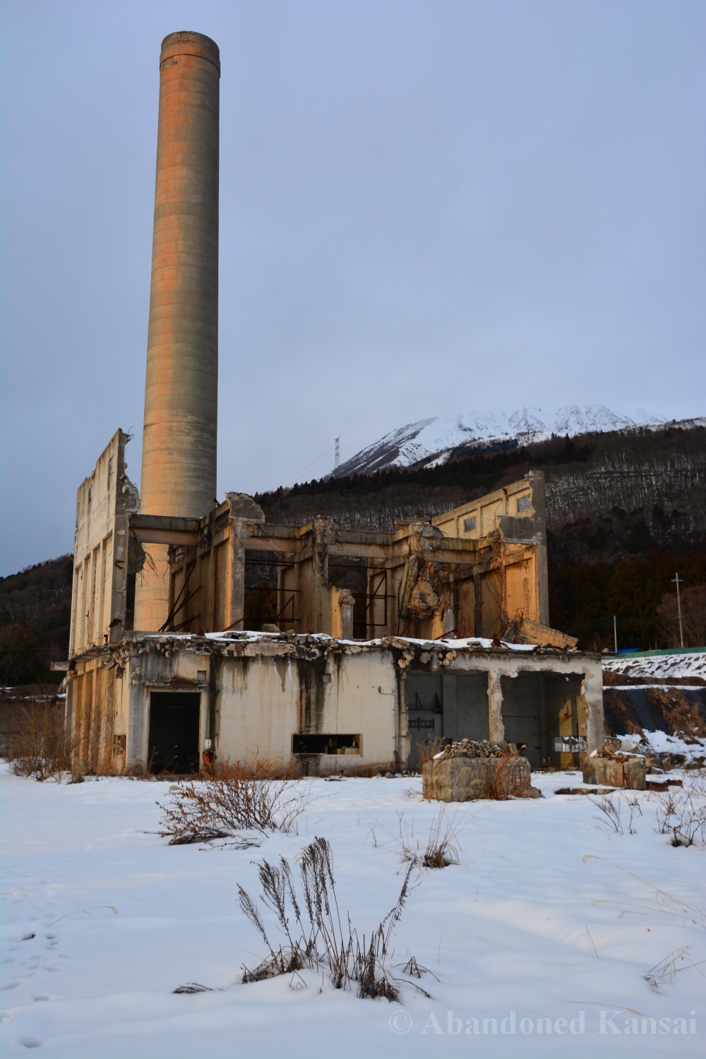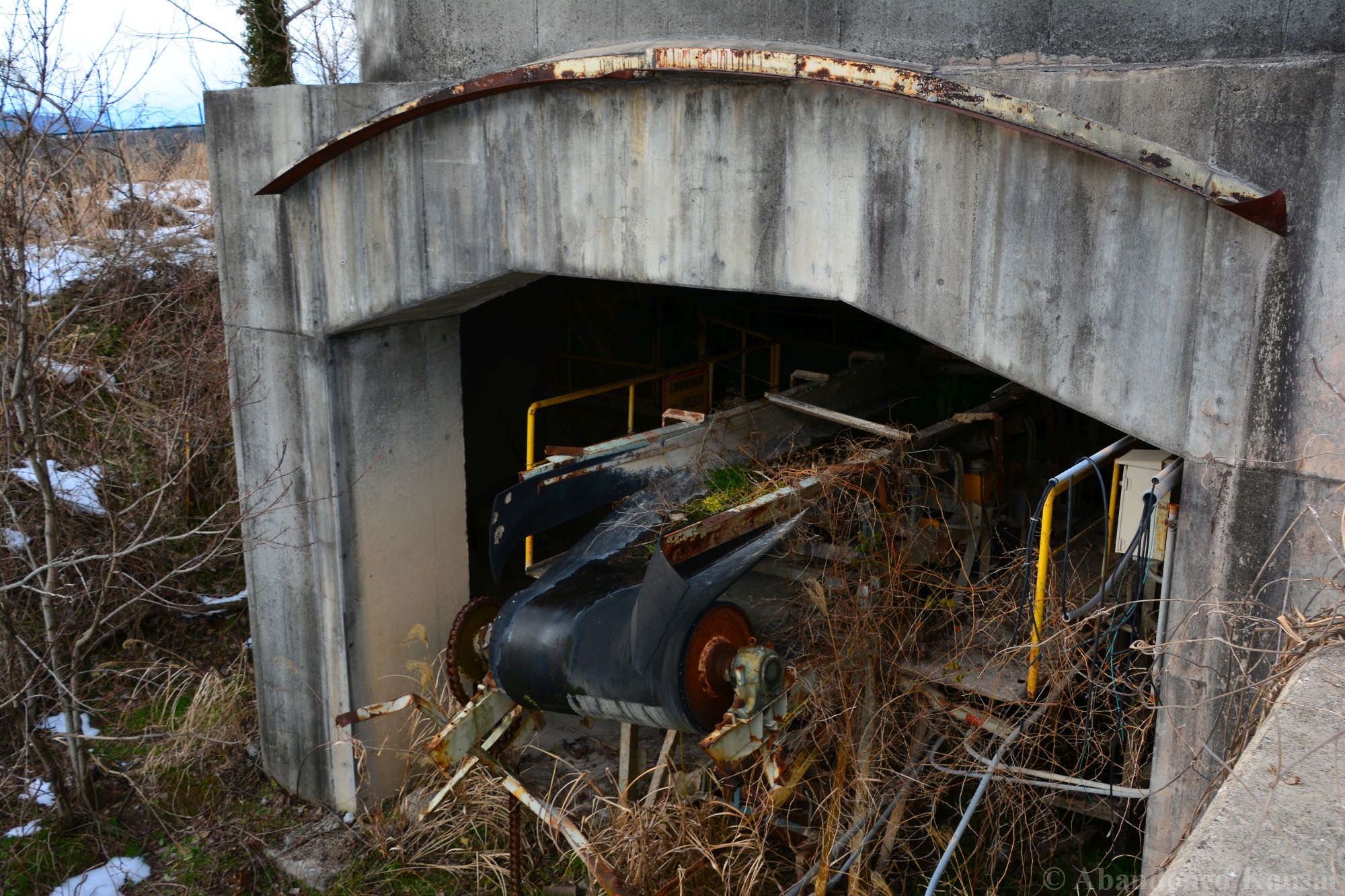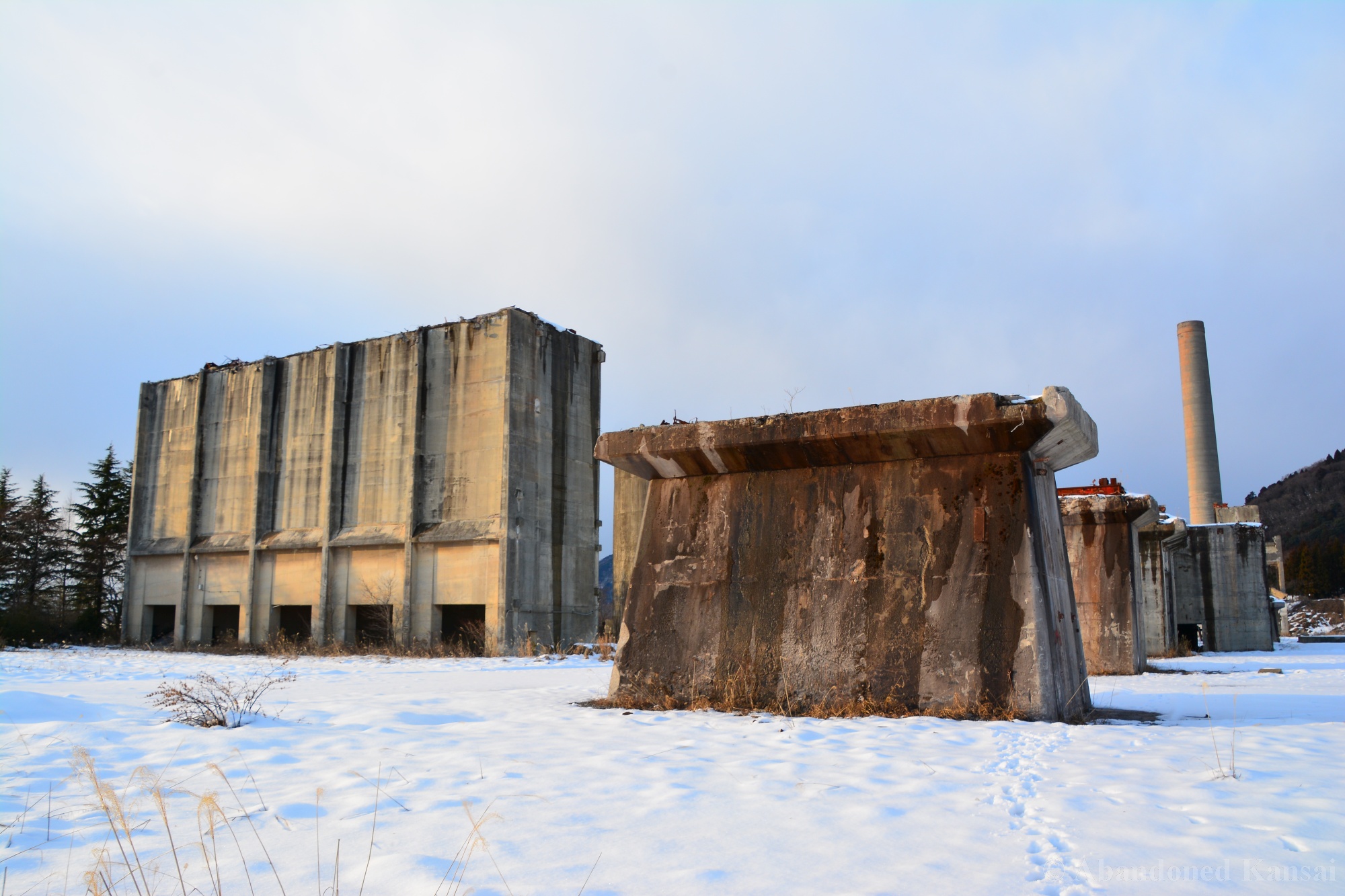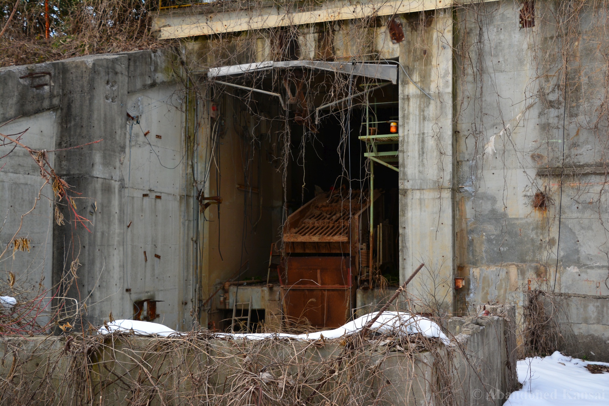 Usually I don’t do revisits. They bore me, they bore you, they don’t do well here on Abandoned Kansai. But there are exploration days when I’m not in charge of the location selection, which sometimes is a good thing (as I get taken to places I didn’t even know existed) and sometimes is a bad thing as I’m stuck at places I don’t like or already have documented extensively. In early 2018 I was on the road with a large group of people (the largest ever, almost a dozen explorers in two large cars) and it was really chaotic as nobody wanted to take the lead (or listen to the only gaijin they apparently considered pretty much dead weight), so there were endless time-consuming consensus discussions, but not much exploring – and of course in the afternoon we ended up at the almost touristy *Sumitomo Osaka Cement Factory, which I had explored about 4 years earlier on a late summer morning*. Seriously annoyed by the inability of the group to make decisions I teeth-gnashingly got out of the warm car and into the mid-winter cold. (While there is no winter in central Osaka, you can definitely get to some snowy areas in day trip range. Not real winter like in Hokkaido, but at least it’s worth putting on a jacket…)