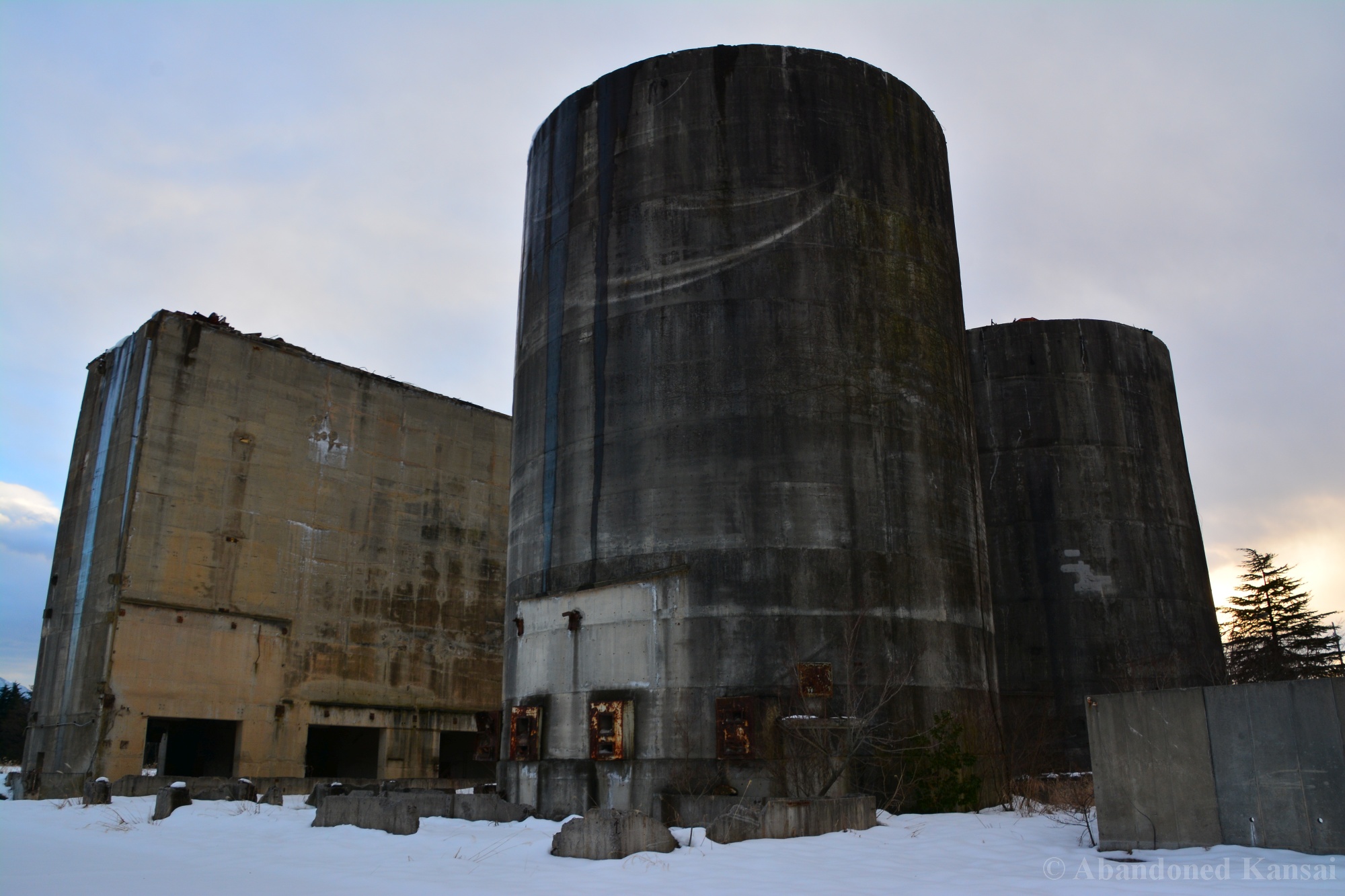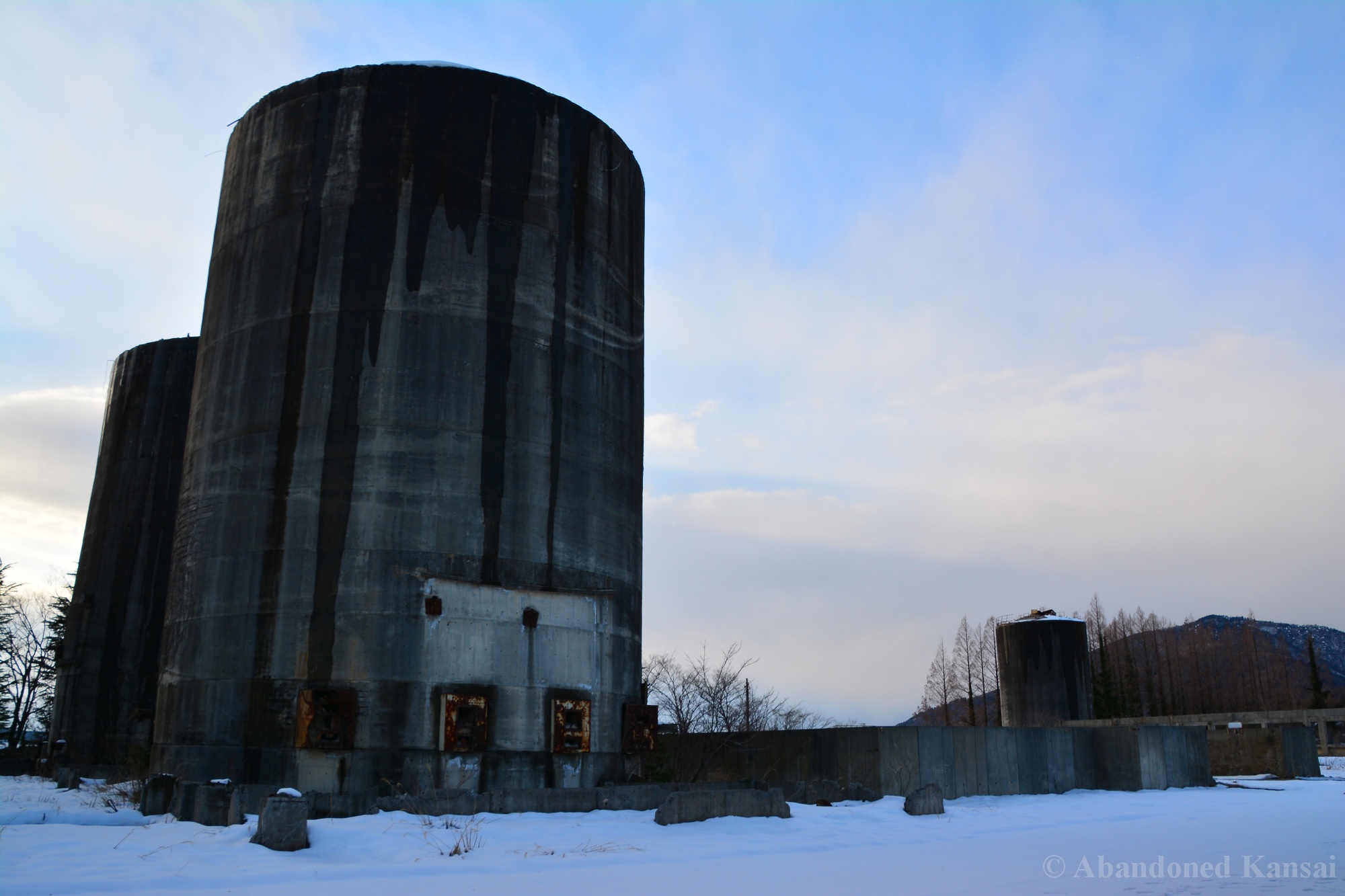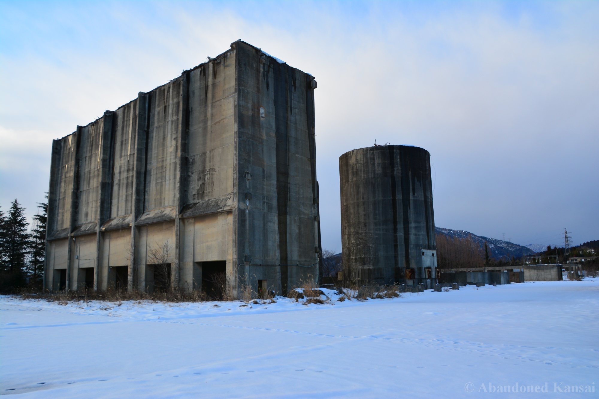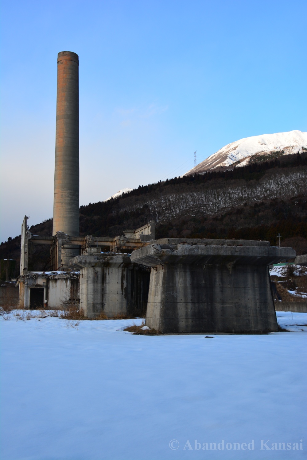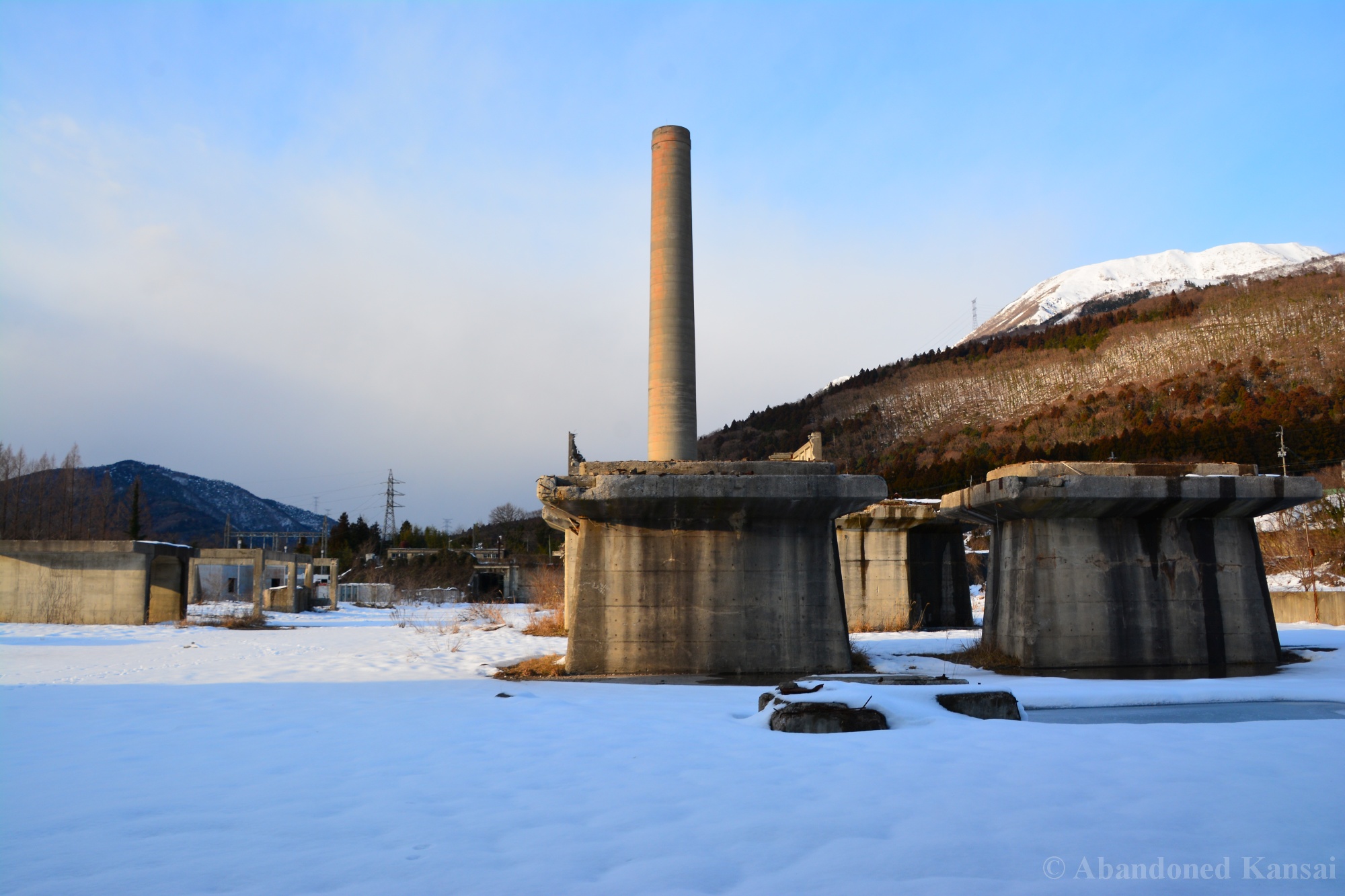 Usually I don’t do revisits. They bore me, they bore you, they don’t do well here on Abandoned Kansai. But there are exploration days when I’m not in charge of the location selection, which sometimes is a good thing (as I get taken to places I didn’t even know existed) and sometimes is a bad thing as I’m stuck at places I don’t like or already have documented extensively. In early 2018 I was on the road with a large group of people (the largest ever, almost a dozen explorers in two large cars) and it was really chaotic as nobody wanted to take the lead (or listen to the only gaijin they apparently considered pretty much dead weight), so there were endless time-consuming consensus discussions, but not much exploring – and of course in the afternoon we ended up at the almost touristy *Sumitomo Osaka Cement Factory, which I had explored about 4 years earlier on a late summer morning*. Seriously annoyed by the inability of the group to make decisions I teeth-gnashingly got out of the warm car and into the mid-winter cold. (While there is no winter in central Osaka, you can definitely get to some snowy areas in day trip range. Not real winter like in Hokkaido, but at least it’s worth putting on a jacket…)
