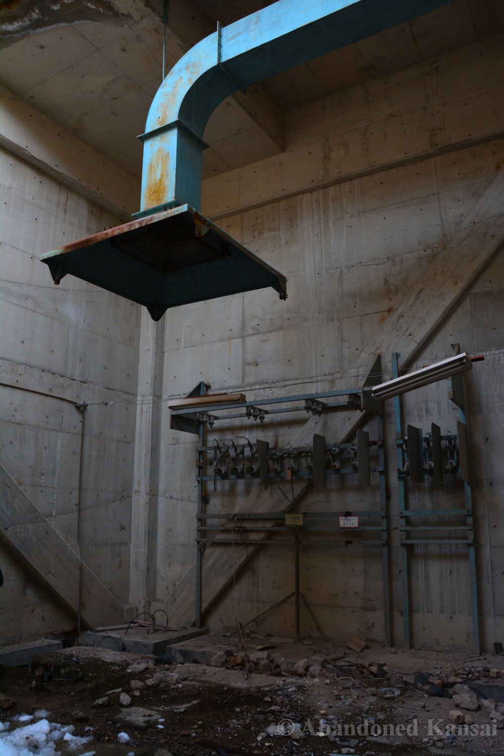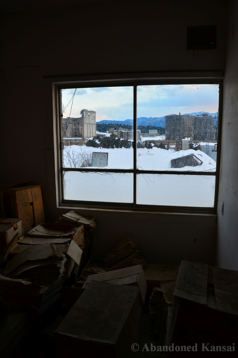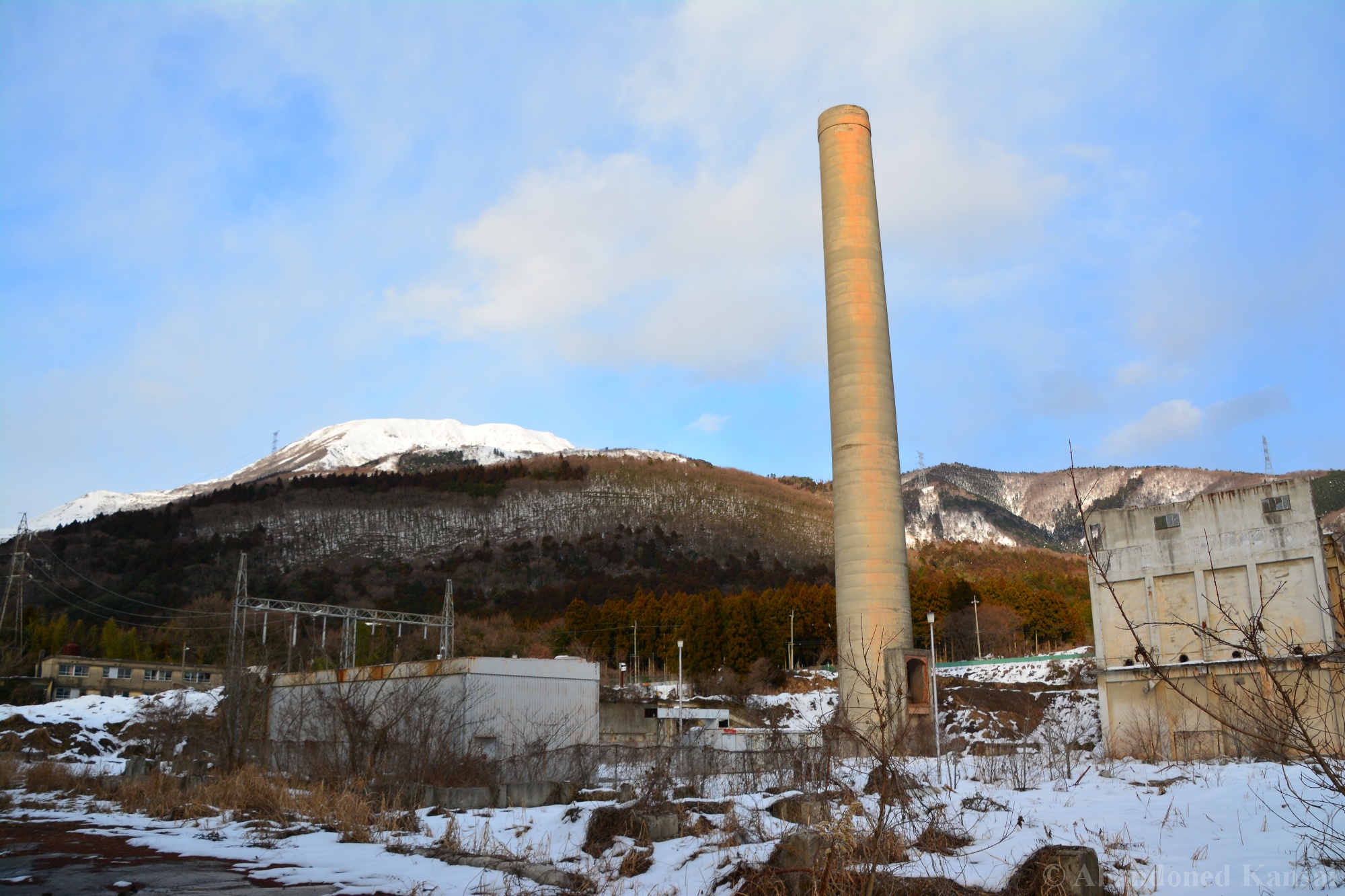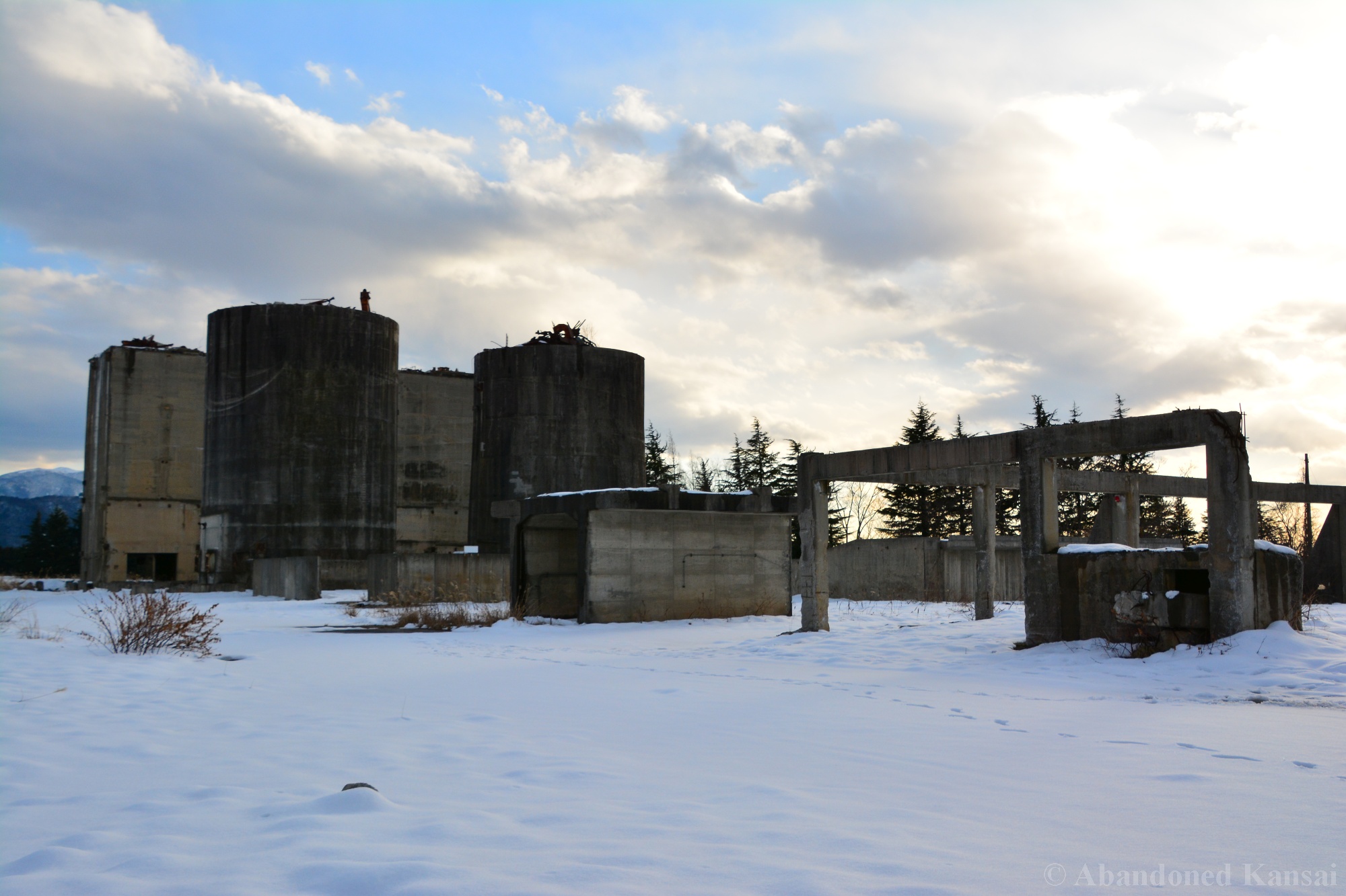 Usually I don’t do revisits. They bore me, they bore you, they don’t do well here on Abandoned Kansai. But there are exploration days when I’m not in charge of the location selection, which sometimes is a good thing (as I get taken to places I didn’t even know existed) and sometimes is a bad thing as I’m stuck at places I don’t like or already have documented extensively. In early 2018 I was on the road with a large group of people (the largest ever, almost a dozen explorers in two large cars) and it was really chaotic as nobody wanted to take the lead (or listen to the only gaijin they apparently considered pretty much dead weight), so there were endless time-consuming consensus discussions, but not much exploring – and of course in the afternoon we ended up at the almost touristy *Sumitomo Osaka Cement Factory, which I had explored about 4 years earlier on a late summer morning*. Seriously annoyed by the inability of the group to make decisions I teeth-gnashingly got out of the warm car and into the mid-winter cold. (While there is no winter in central Osaka, you can definitely get to some snowy areas in day trip range. Not real winter like in Hokkaido, but at least it’s worth putting on a jacket…)