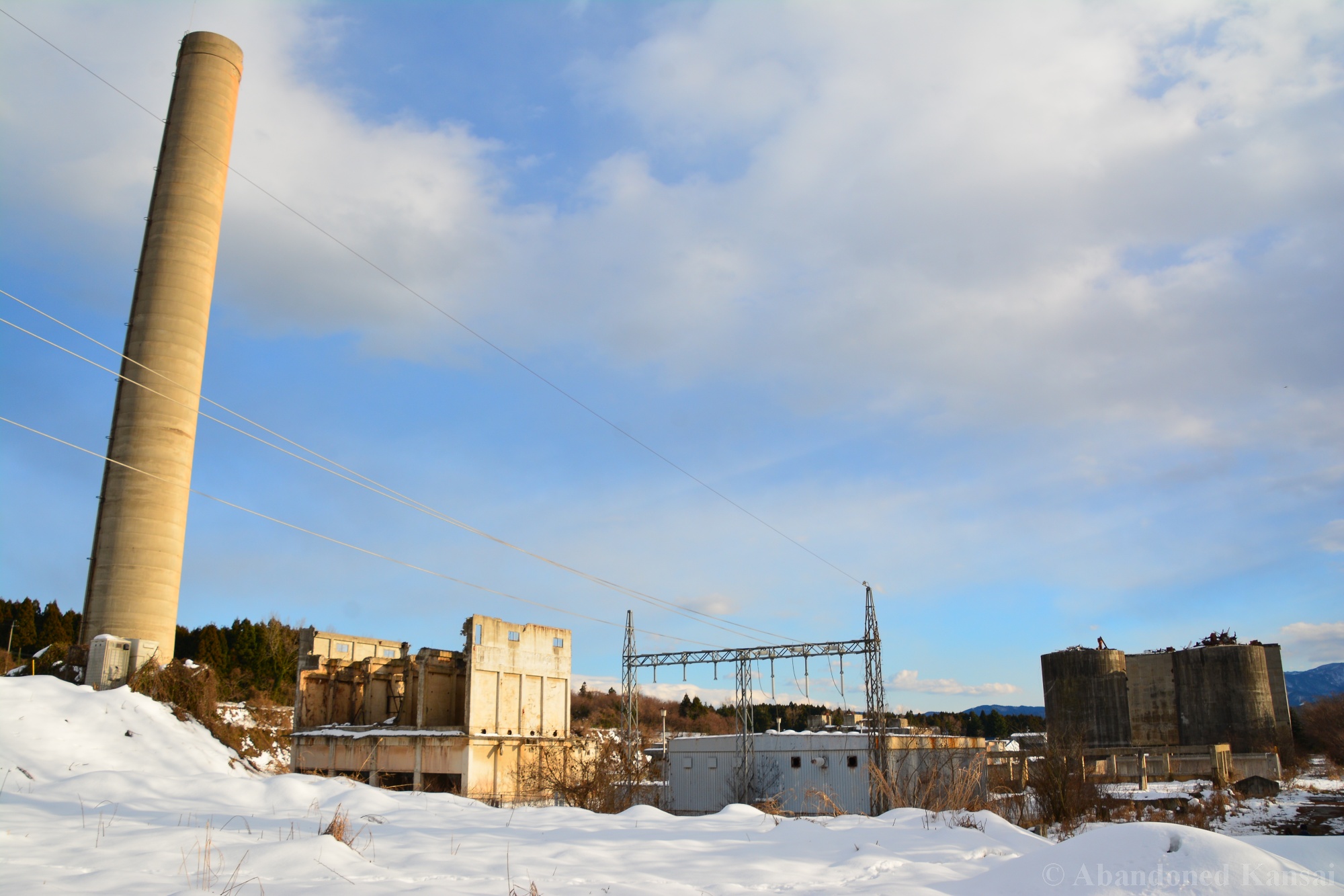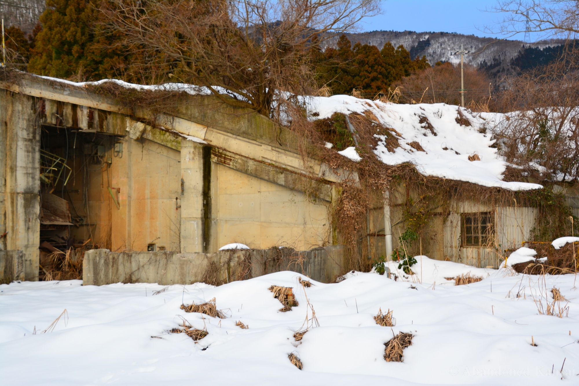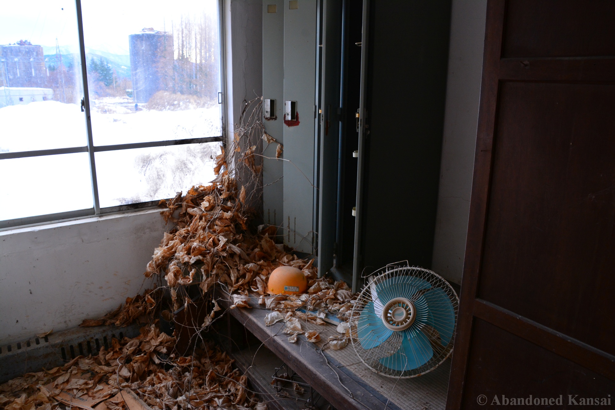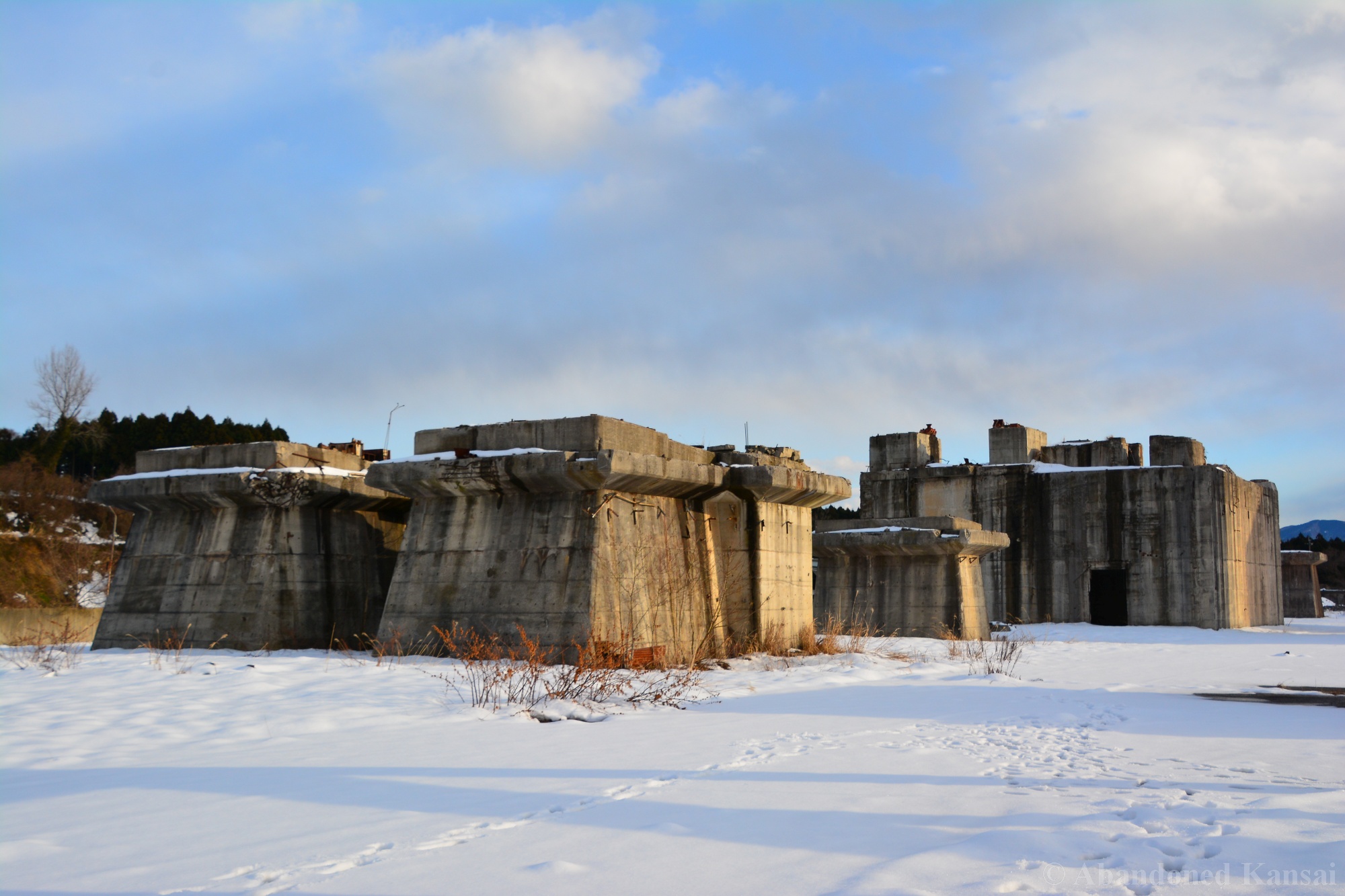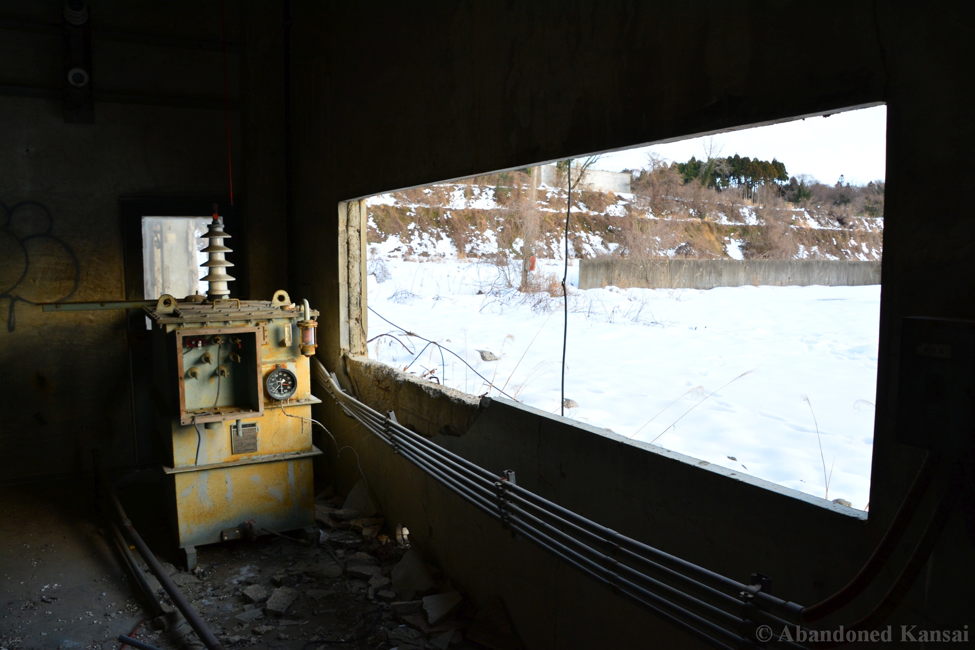 Usually I don’t do revisits. They bore me, they bore you, they don’t do well here on Abandoned Kansai. But there are exploration days when I’m not in charge of the location selection, which sometimes is a good thing (as I get taken to places I didn’t even know existed) and sometimes is a bad thing as I’m stuck at places I don’t like or already have documented extensively. In early 2018 I was on the road with a large group of people (the largest ever, almost a dozen explorers in two large cars) and it was really chaotic as nobody wanted to take the lead (or listen to the only gaijin they apparently considered pretty much dead weight), so there were endless time-consuming consensus discussions, but not much exploring – and of course in the afternoon we ended up at the almost touristy *Sumitomo Osaka Cement Factory, which I had explored about 4 years earlier on a late summer morning*. Seriously annoyed by the inability of the group to make decisions I teeth-gnashingly got out of the warm car and into the mid-winter cold. (While there is no winter in central Osaka, you can definitely get to some snowy areas in day trip range. Not real winter like in Hokkaido, but at least it’s worth putting on a jacket…)