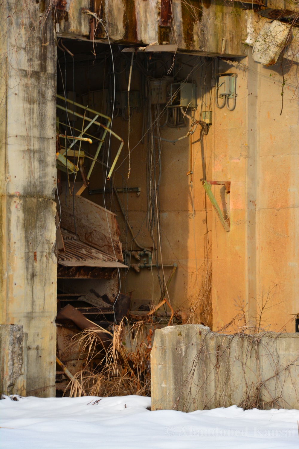 The different time of the day and especially the different season with the completely different weather made this one of the few revisits actually worth my (and your!) time. The outdoor part wasn’t that much fun since the area was completely covered in snow. Not deeply, but enough to make walking around a bit iffy as you never knew what you would step on / in next – and it wasn’t until I got home and looked at the photos that I realized that the area had a very strong Star Wars vibe; like after the battle on the ice planet Hoth. A completely different atmosphere than in early September… and an almost completely overgrown building was all of a sudden accessible again. In summer vines and other plants covered pretty much all of the ground floor windows and especially the doors, so the it was only upon my second visit that I could enter the building – which wasn’t spectacular by any standards, but a nice addition to the exploration and the photo set, despite the rapidly fading light.