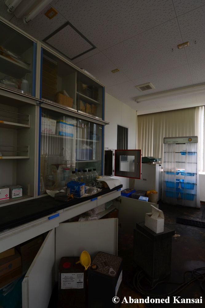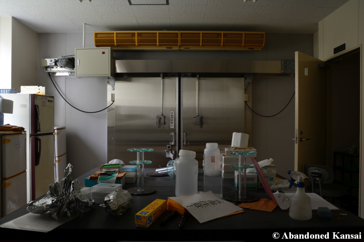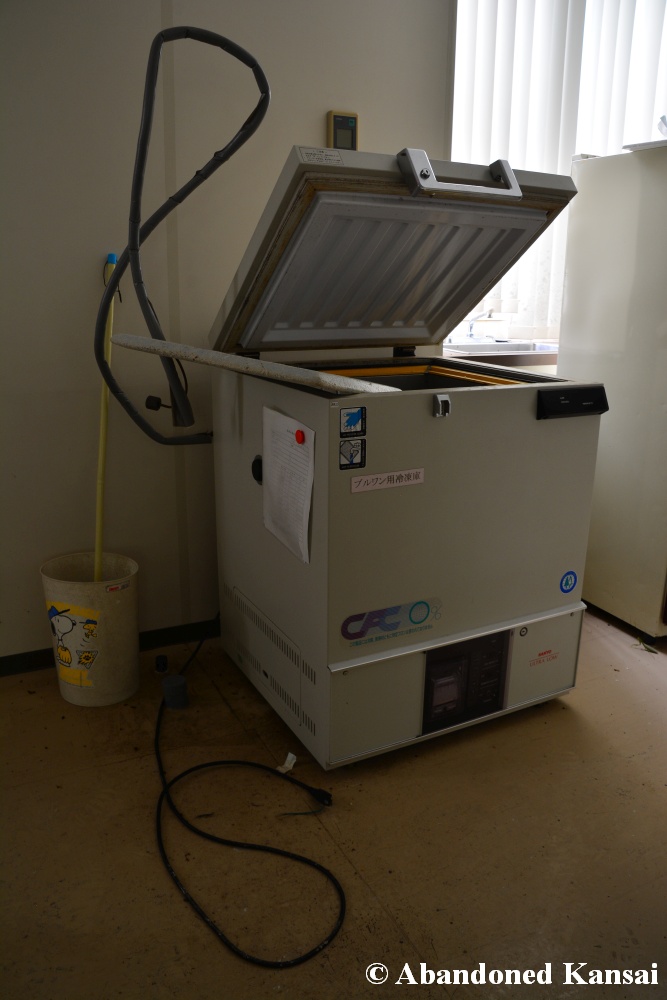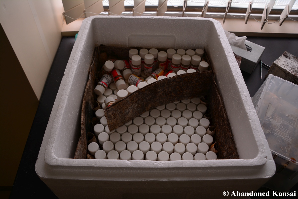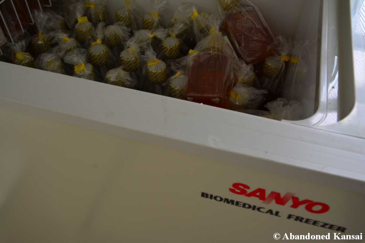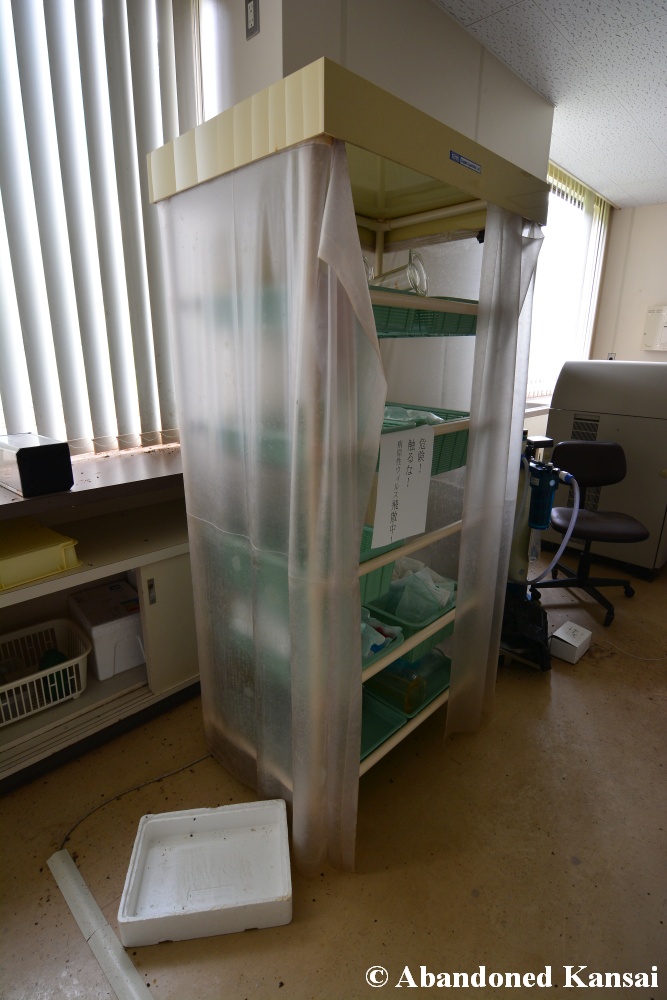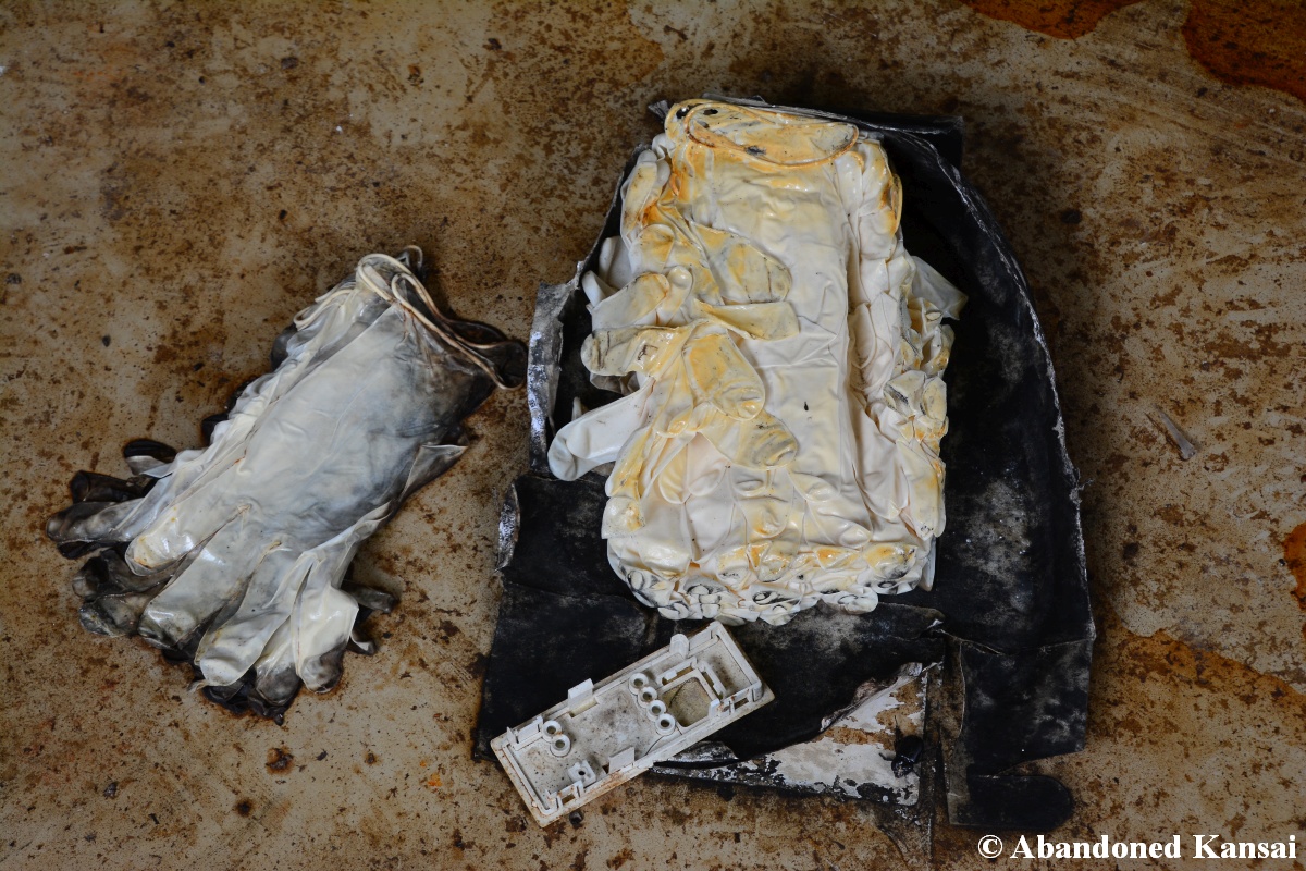 Of course I wasn’t aware of all of that upon entering – to me this was a real exploration, I just knew about the standard laboratories and a few biohazard signs… and that was all I got for the first few minutes. Then I saw one of those freezers with a lock… and it had a laminated piece of paper on top, clearly added long after the facility was abandoned. (How one can abandon or even just close a facility like that without the authorities stepping in is beyond me – but hey, welcome to Japan!) At first I ignored the freezers – I’m not the touchy / moving things around type of explorer anyway and in this case I valued my health and safety even more, so I made my way through the building, at one point losing contact with my co-explorers – which was actually scary, because this place was by far the creepiest I’ve ever been to. That’s the kind of place you explore in a video game while your character is wearing a hazmat suit. I was wearing jeans and a T-shirt and for protection a 200 Yen mask, no gloves. And this place wasn’t digital, it was real. With real dark corners, real chemicals, real danger! I don’t care about how tough you think you are, but when you explore a dusty, slightly vandalized biotech company that was experimenting on / with dogs and you see a poster about how Coxiella Burnetii, a bacterial pathogen, can affect several parts of the human body, I’m sure your heart drops a bit, too! (“Fun” fact: Coxiella Burnetii was one of seven agents of the United States biological warfare program when it ended in 1969!) At one point towards the end the mental pressure became so big that I decided to find my friends first and explore the last part together… where we found molten plastic gloves on the ground. When you look at the pictures later I don’t know what impression you’ll have, but I can only urge you to remember that this was REAL: Not a movie set, not a disaster museum, not a 4k video game – a real biohazard facility. People walked out, locked everything up, and a few years later we were there; entering through the back, thanks to mild vandalism here and there.