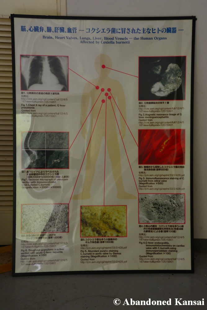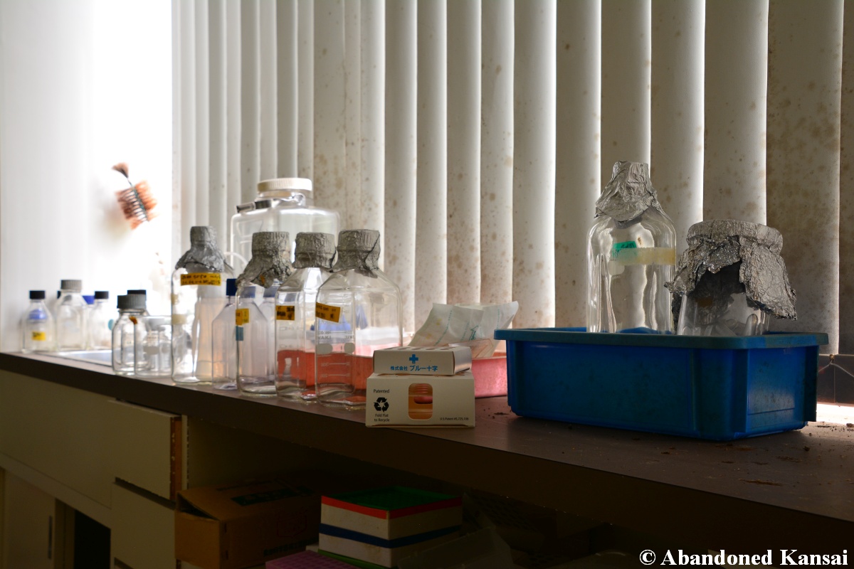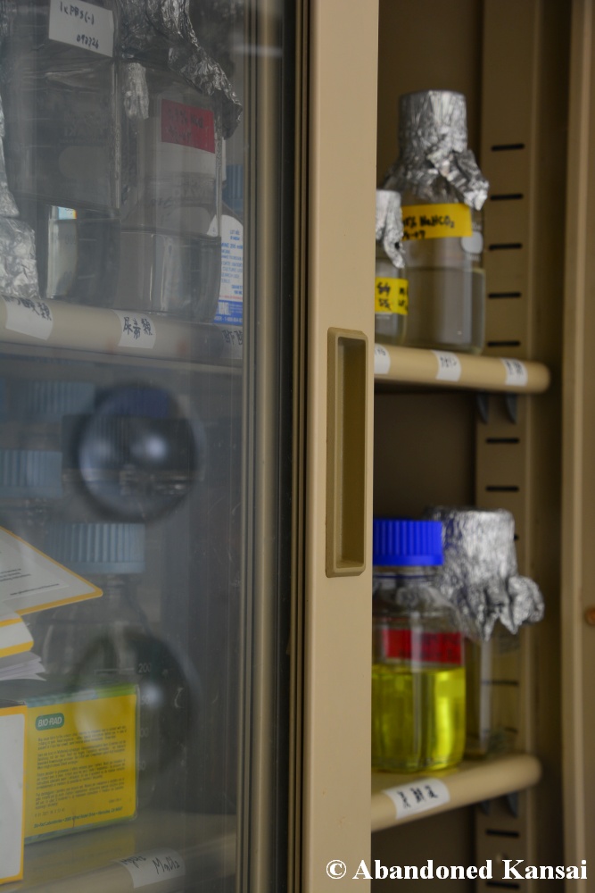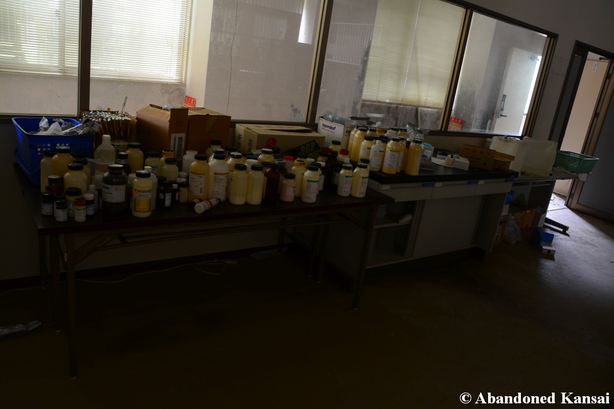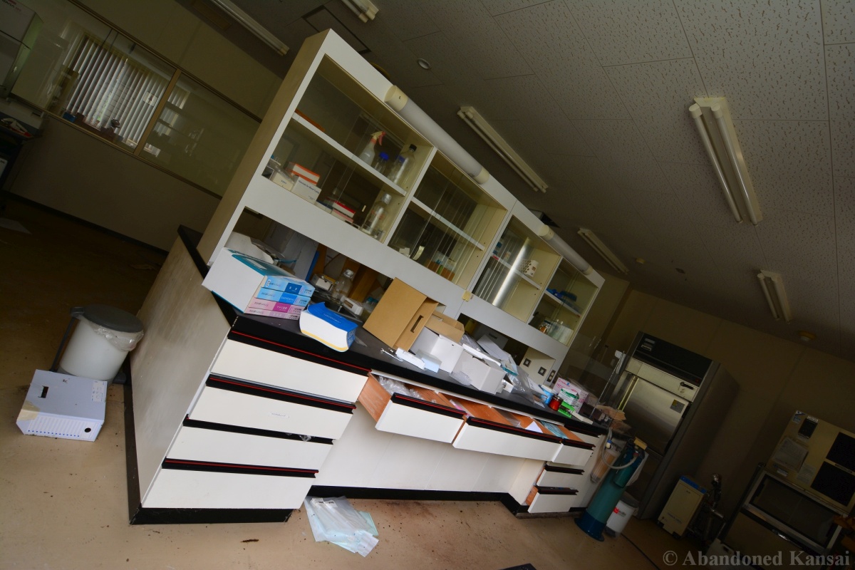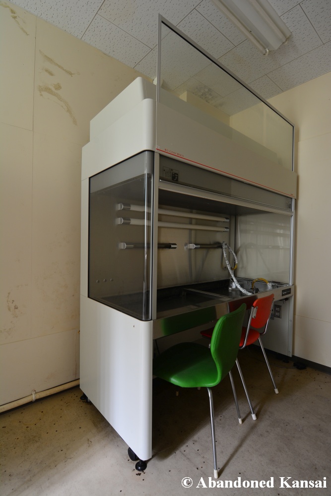 Of course I wasn’t aware of all of that upon entering – to me this was a real exploration, I just knew about the standard laboratories and a few biohazard signs… and that was all I got for the first few minutes. Then I saw one of those freezers with a lock… and it had a laminated piece of paper on top, clearly added long after the facility was abandoned. (How one can abandon or even just close a facility like that without the authorities stepping in is beyond me – but hey, welcome to Japan!) At first I ignored the freezers – I’m not the touchy / moving things around type of explorer anyway and in this case I valued my health and safety even more, so I made my way through the building, at one point losing contact with my co-explorers – which was actually scary, because this place was by far the creepiest I’ve ever been to. That’s the kind of place you explore in a video game while your character is wearing a hazmat suit. I was wearing jeans and a T-shirt and for protection a 200 Yen mask, no gloves. And this place wasn’t digital, it was real. With real dark corners, real chemicals, real danger! I don’t care about how tough you think you are, but when you explore a dusty, slightly vandalized biotech company that was experimenting on / with dogs and you see a poster about how Coxiella Burnetii, a bacterial pathogen, can affect several parts of the human body, I’m sure your heart drops a bit, too! (“Fun” fact: Coxiella Burnetii was one of seven agents of the United States biological warfare program when it ended in 1969!) At one point towards the end the mental pressure became so big that I decided to find my friends first and explore the last part together… where we found molten plastic gloves on the ground. When you look at the pictures later I don’t know what impression you’ll have, but I can only urge you to remember that this was REAL: Not a movie set, not a disaster museum, not a 4k video game – a real biohazard facility. People walked out, locked everything up, and a few years later we were there; entering through the back, thanks to mild vandalism here and there.