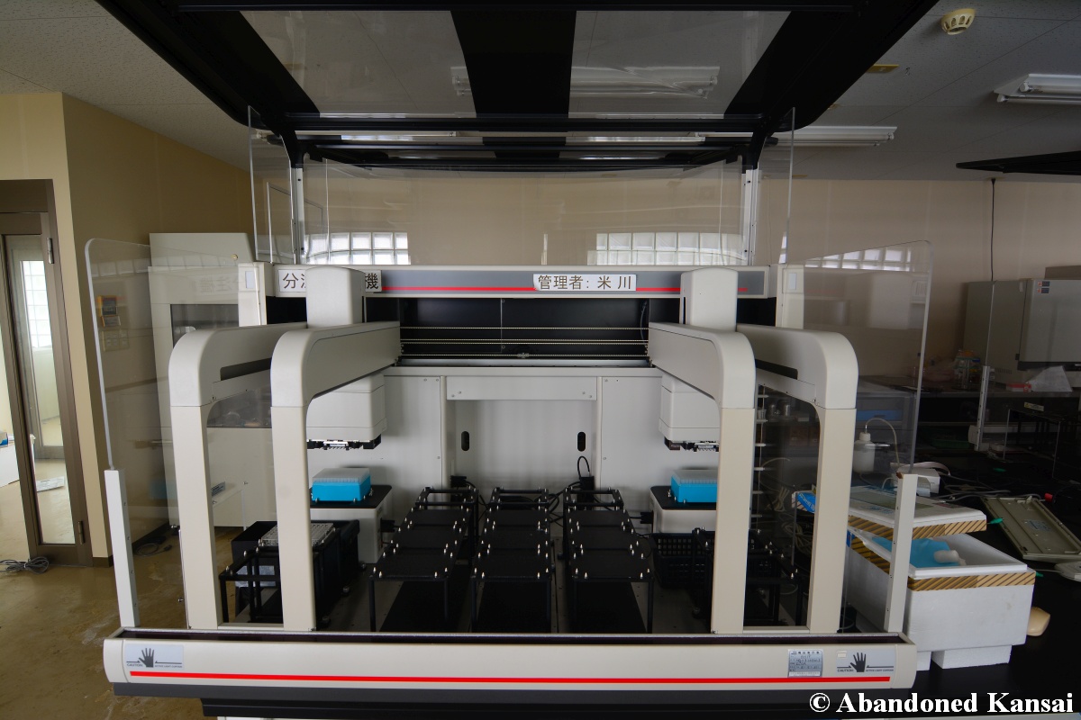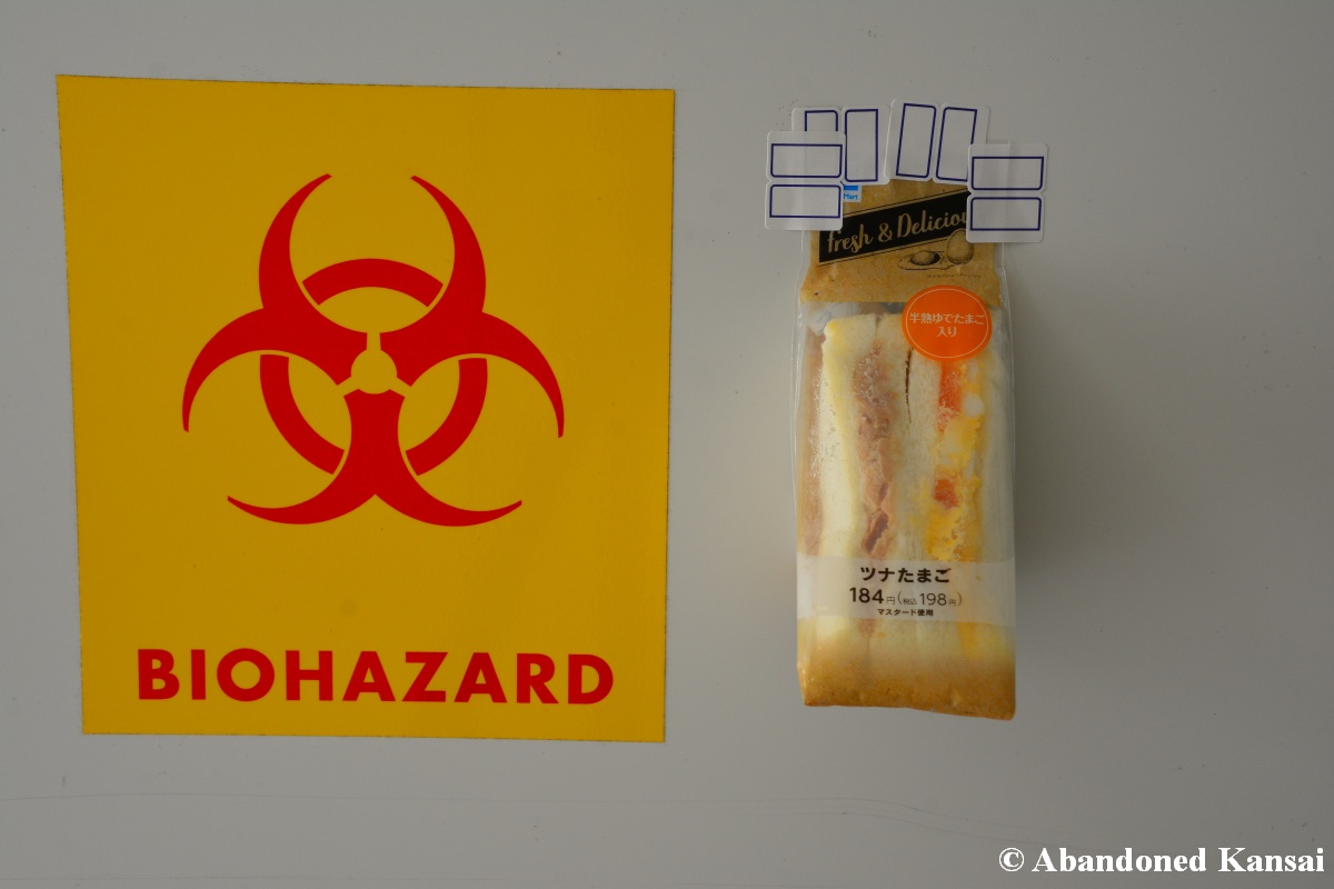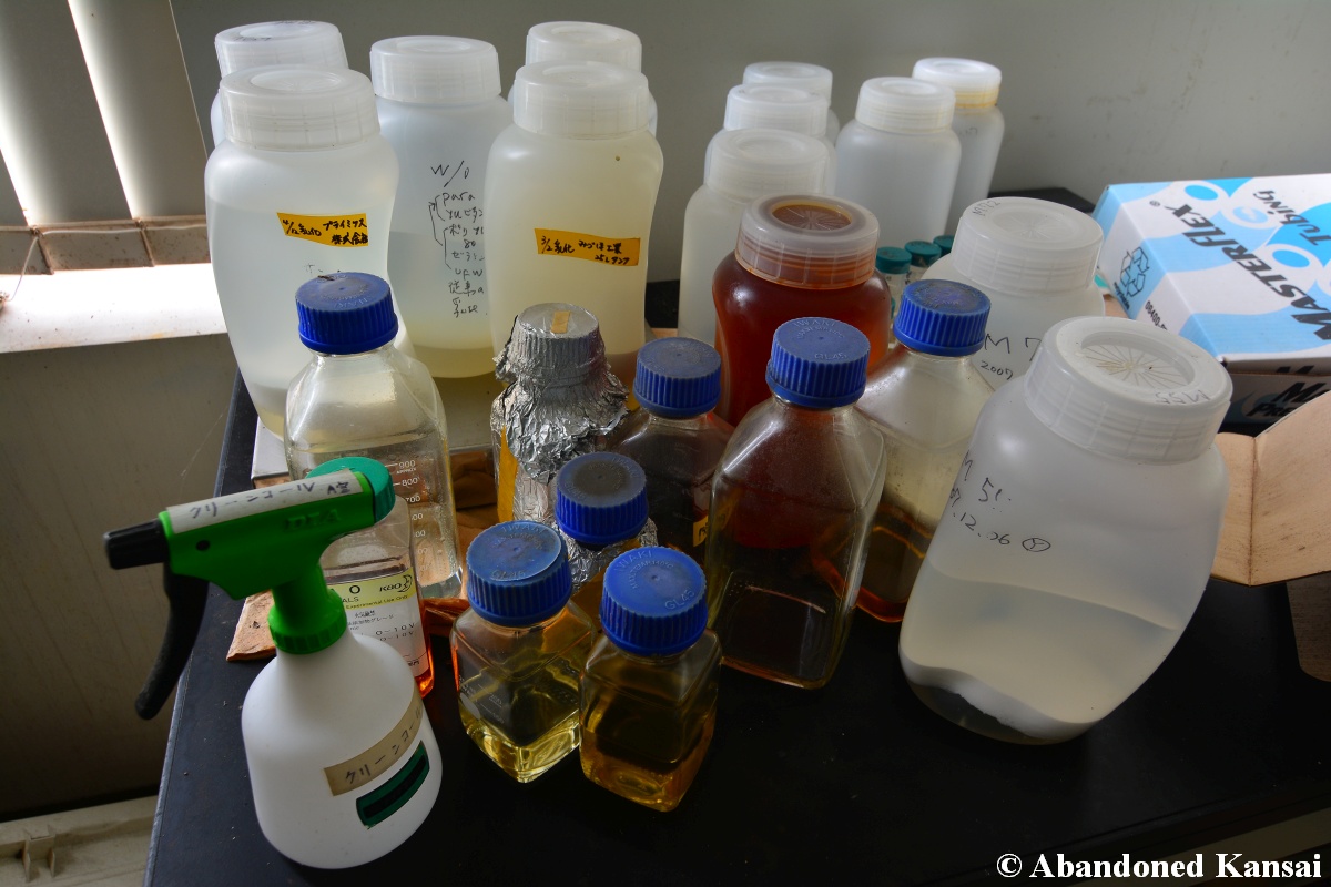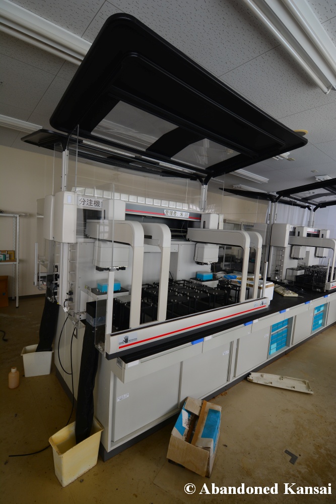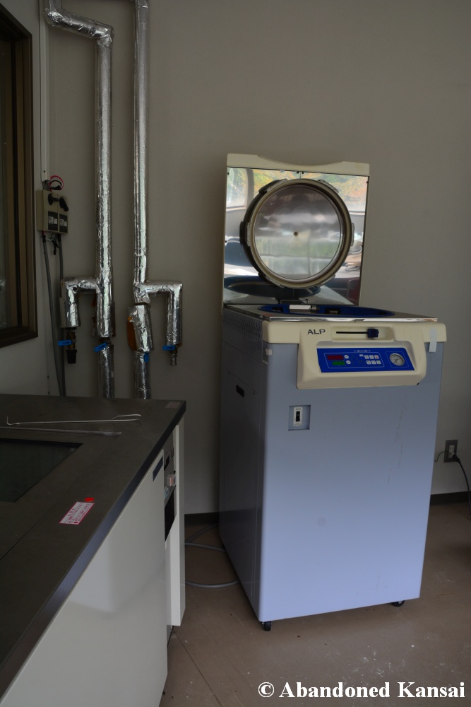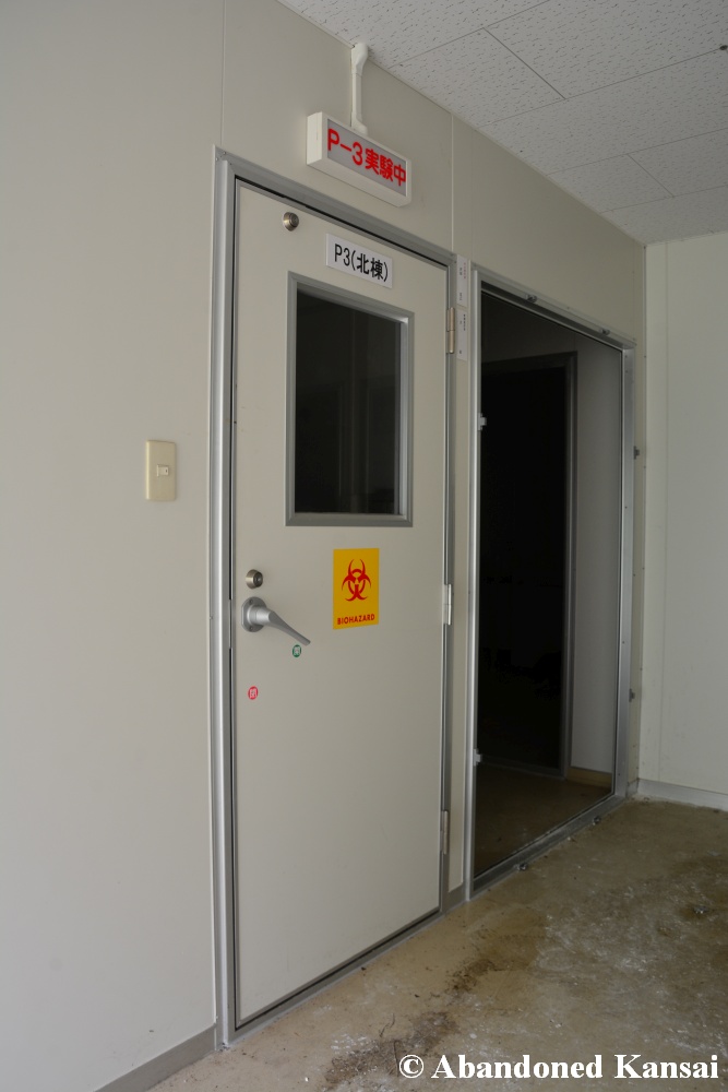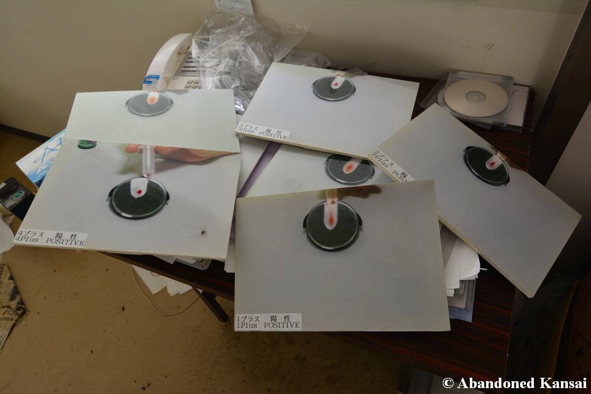 Of course I wasn’t aware of all of that upon entering – to me this was a real exploration, I just knew about the standard laboratories and a few biohazard signs… and that was all I got for the first few minutes. Then I saw one of those freezers with a lock… and it had a laminated piece of paper on top, clearly added long after the facility was abandoned. (How one can abandon or even just close a facility like that without the authorities stepping in is beyond me – but hey, welcome to Japan!) At first I ignored the freezers – I’m not the touchy / moving things around type of explorer anyway and in this case I valued my health and safety even more, so I made my way through the building, at one point losing contact with my co-explorers – which was actually scary, because this place was by far the creepiest I’ve ever been to. That’s the kind of place you explore in a video game while your character is wearing a hazmat suit. I was wearing jeans and a T-shirt and for protection a 200 Yen mask, no gloves. And this place wasn’t digital, it was real. With real dark corners, real chemicals, real danger! I don’t care about how tough you think you are, but when you explore a dusty, slightly vandalized biotech company that was experimenting on / with dogs and you see a poster about how Coxiella Burnetii, a bacterial pathogen, can affect several parts of the human body, I’m sure your heart drops a bit, too! (“Fun” fact: Coxiella Burnetii was one of seven agents of the United States biological warfare program when it ended in 1969!) At one point towards the end the mental pressure became so big that I decided to find my friends first and explore the last part together… where we found molten plastic gloves on the ground. When you look at the pictures later I don’t know what impression you’ll have, but I can only urge you to remember that this was REAL: Not a movie set, not a disaster museum, not a 4k video game – a real biohazard facility. People walked out, locked everything up, and a few years later we were there; entering through the back, thanks to mild vandalism here and there.
