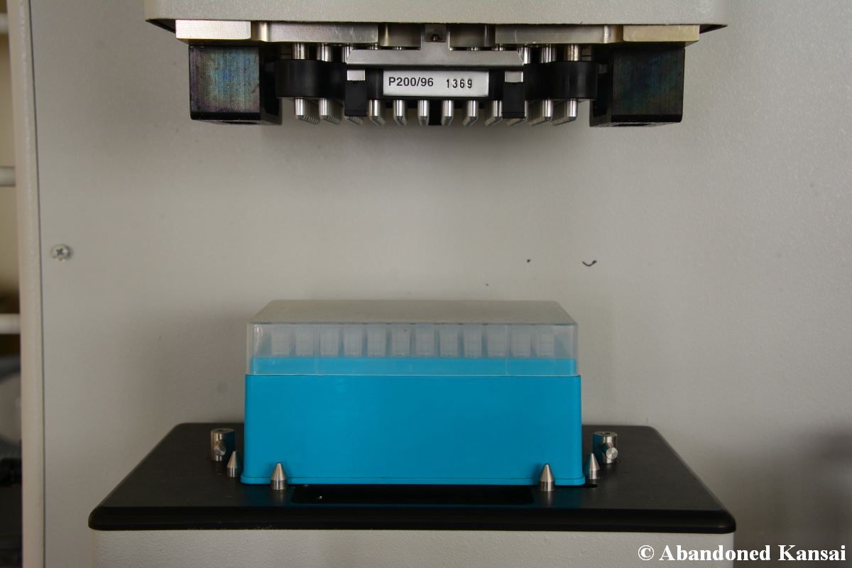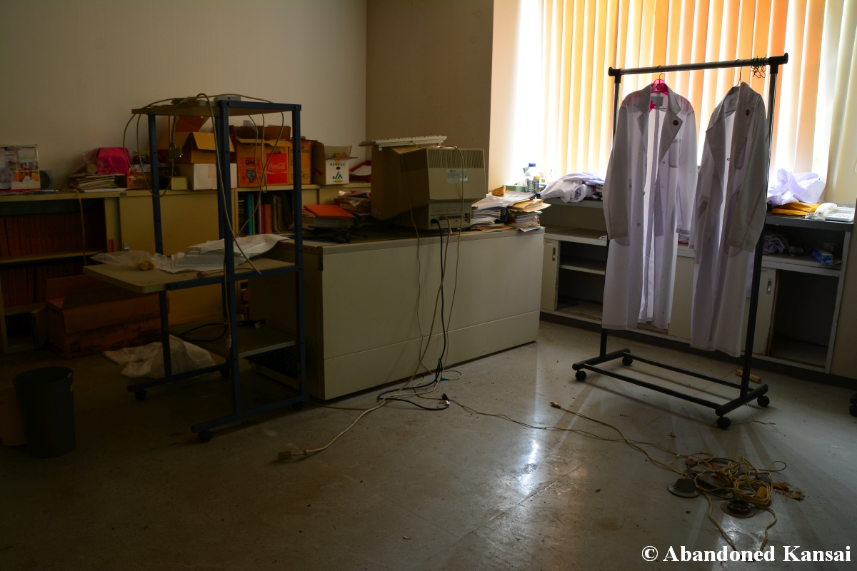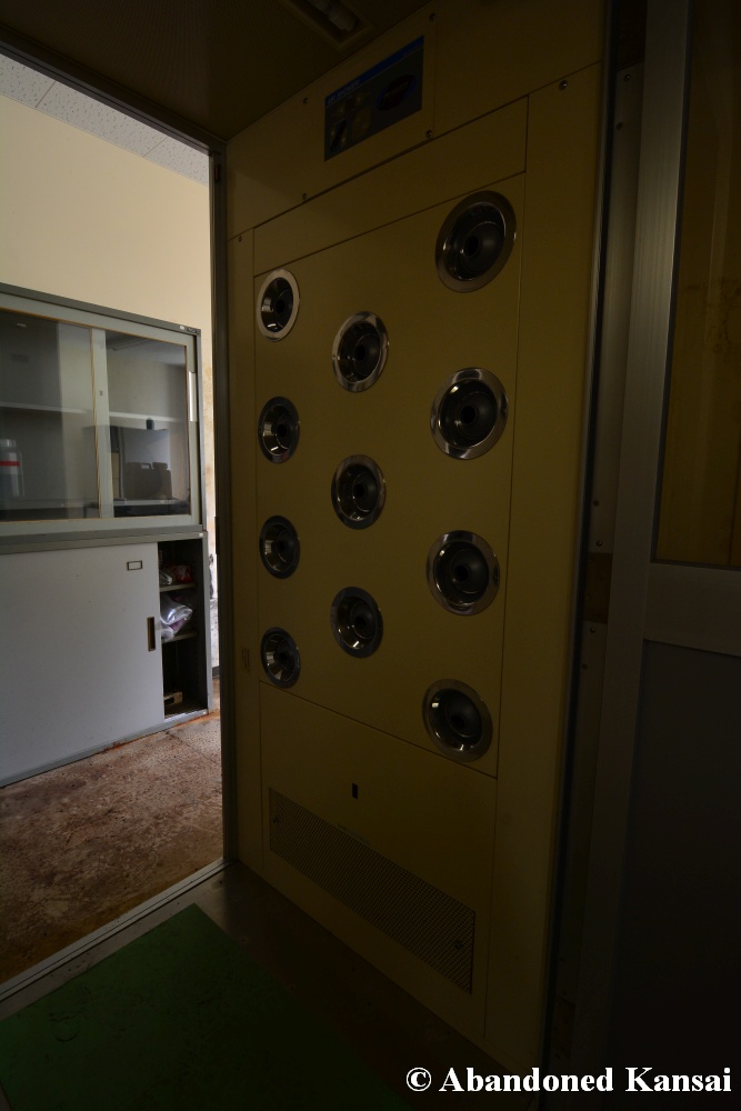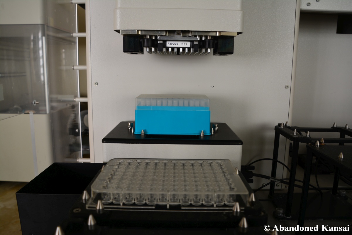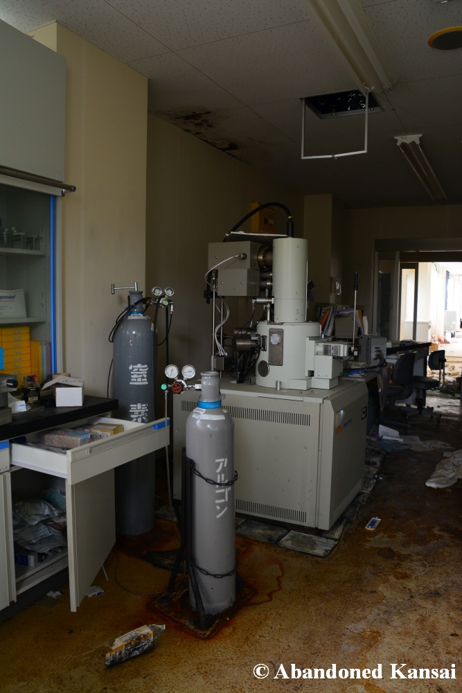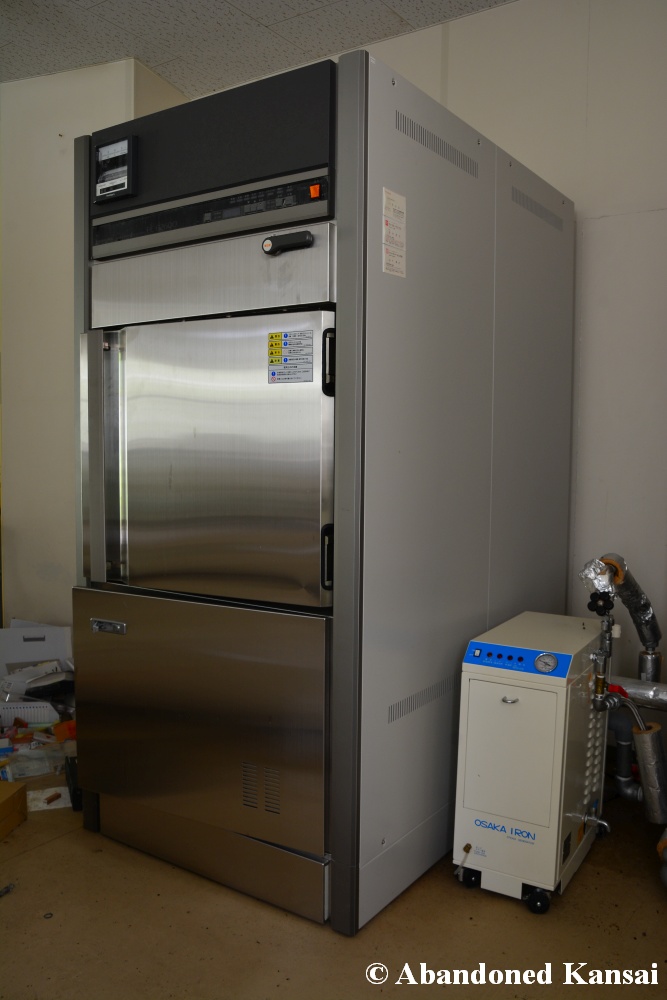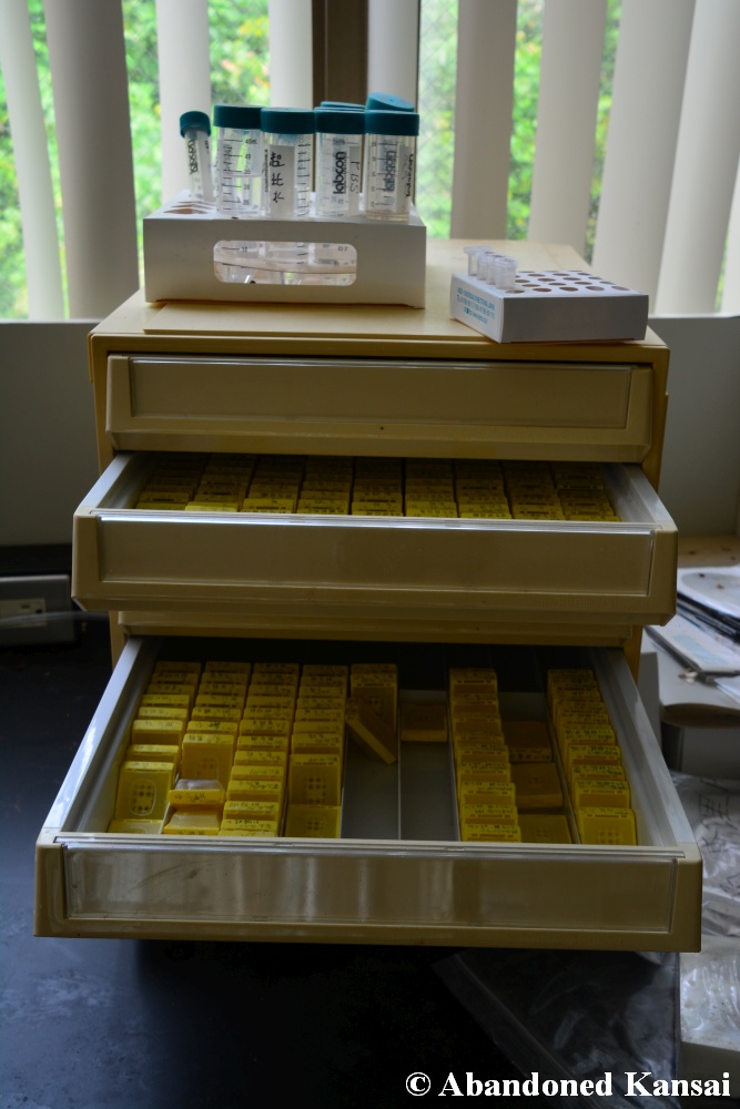 Of course I wasn’t aware of all of that upon entering – to me this was a real exploration, I just knew about the standard laboratories and a few biohazard signs… and that was all I got for the first few minutes. Then I saw one of those freezers with a lock… and it had a laminated piece of paper on top, clearly added long after the facility was abandoned. (How one can abandon or even just close a facility like that without the authorities stepping in is beyond me – but hey, welcome to Japan!) At first I ignored the freezers – I’m not the touchy / moving things around type of explorer anyway and in this case I valued my health and safety even more, so I made my way through the building, at one point losing contact with my co-explorers – which was actually scary, because this place was by far the creepiest I’ve ever been to. That’s the kind of place you explore in a video game while your character is wearing a hazmat suit. I was wearing jeans and a T-shirt and for protection a 200 Yen mask, no gloves. And this place wasn’t digital, it was real. With real dark corners, real chemicals, real danger! I don’t care about how tough you think you are, but when you explore a dusty, slightly vandalized biotech company that was experimenting on / with dogs and you see a poster about how Coxiella Burnetii, a bacterial pathogen, can affect several parts of the human body, I’m sure your heart drops a bit, too! (“Fun” fact: Coxiella Burnetii was one of seven agents of the United States biological warfare program when it ended in 1969!) At one point towards the end the mental pressure became so big that I decided to find my friends first and explore the last part together… where we found molten plastic gloves on the ground. When you look at the pictures later I don’t know what impression you’ll have, but I can only urge you to remember that this was REAL: Not a movie set, not a disaster museum, not a 4k video game – a real biohazard facility. People walked out, locked everything up, and a few years later we were there; entering through the back, thanks to mild vandalism here and there.