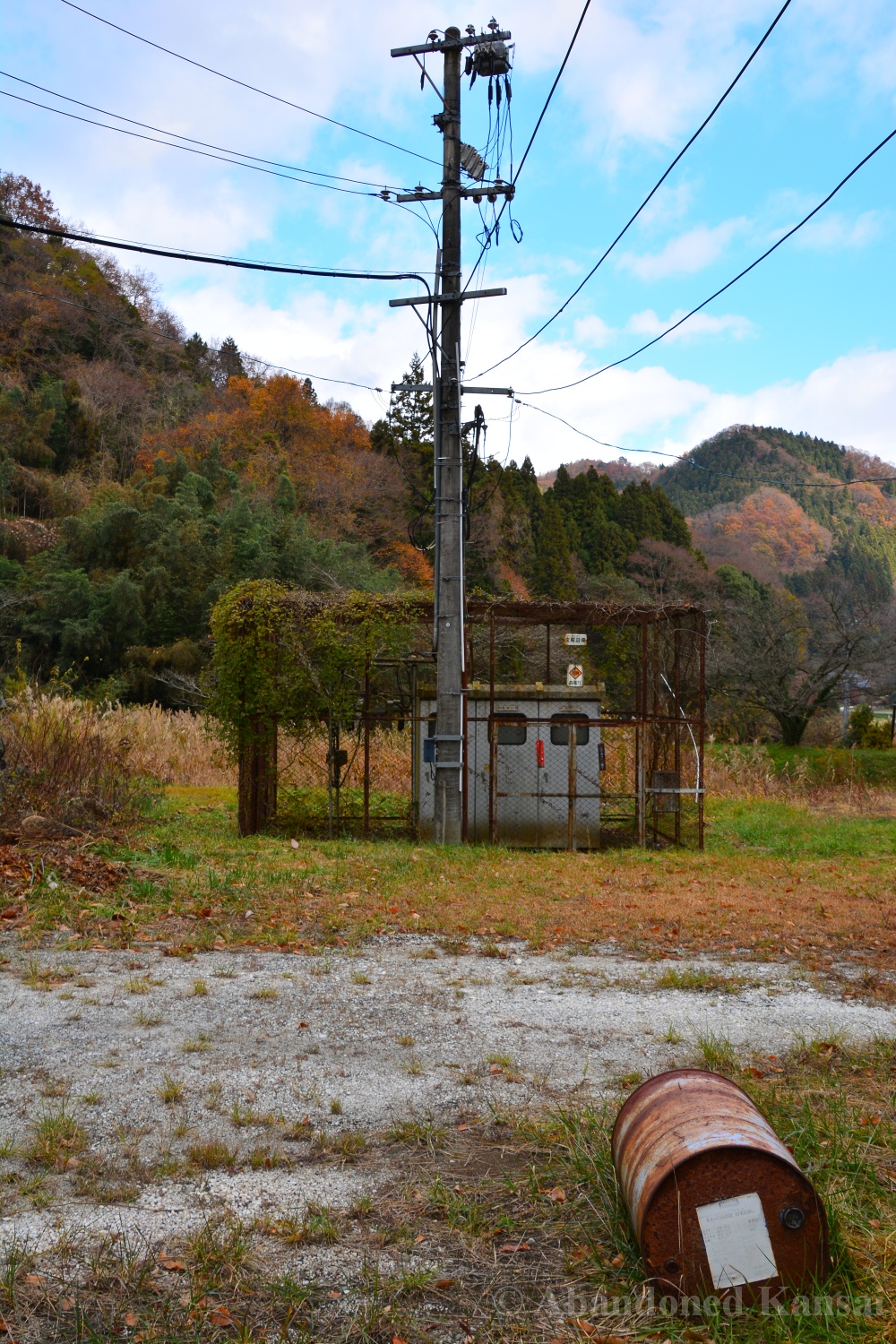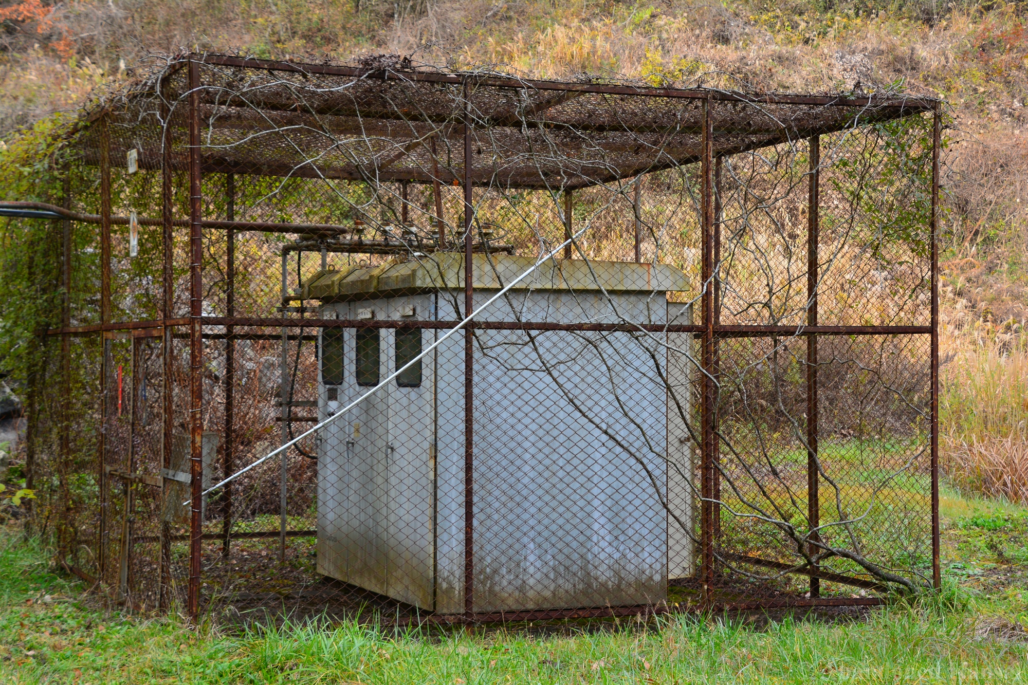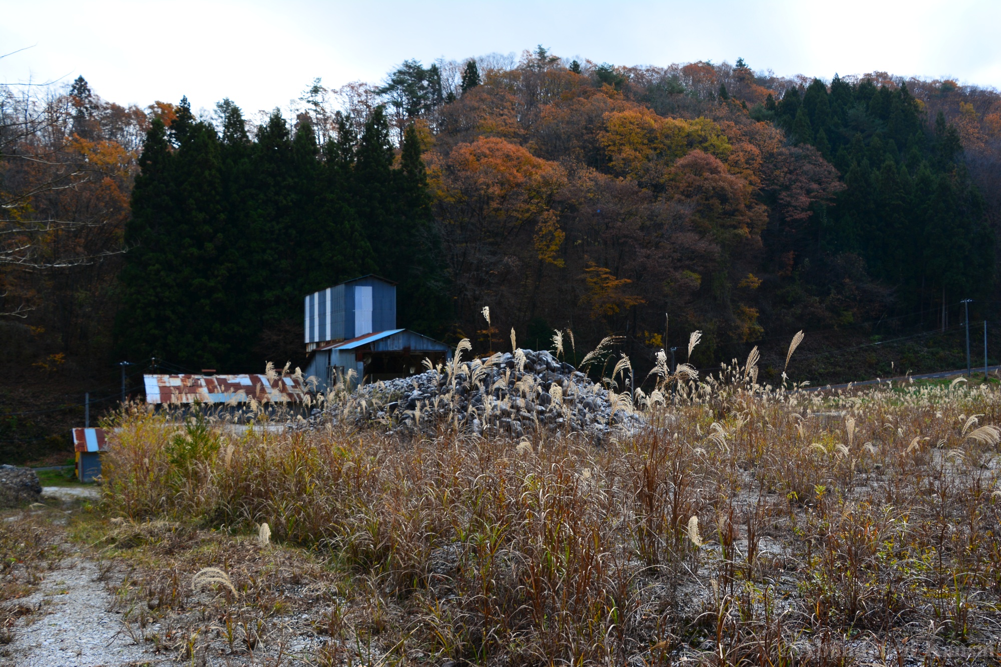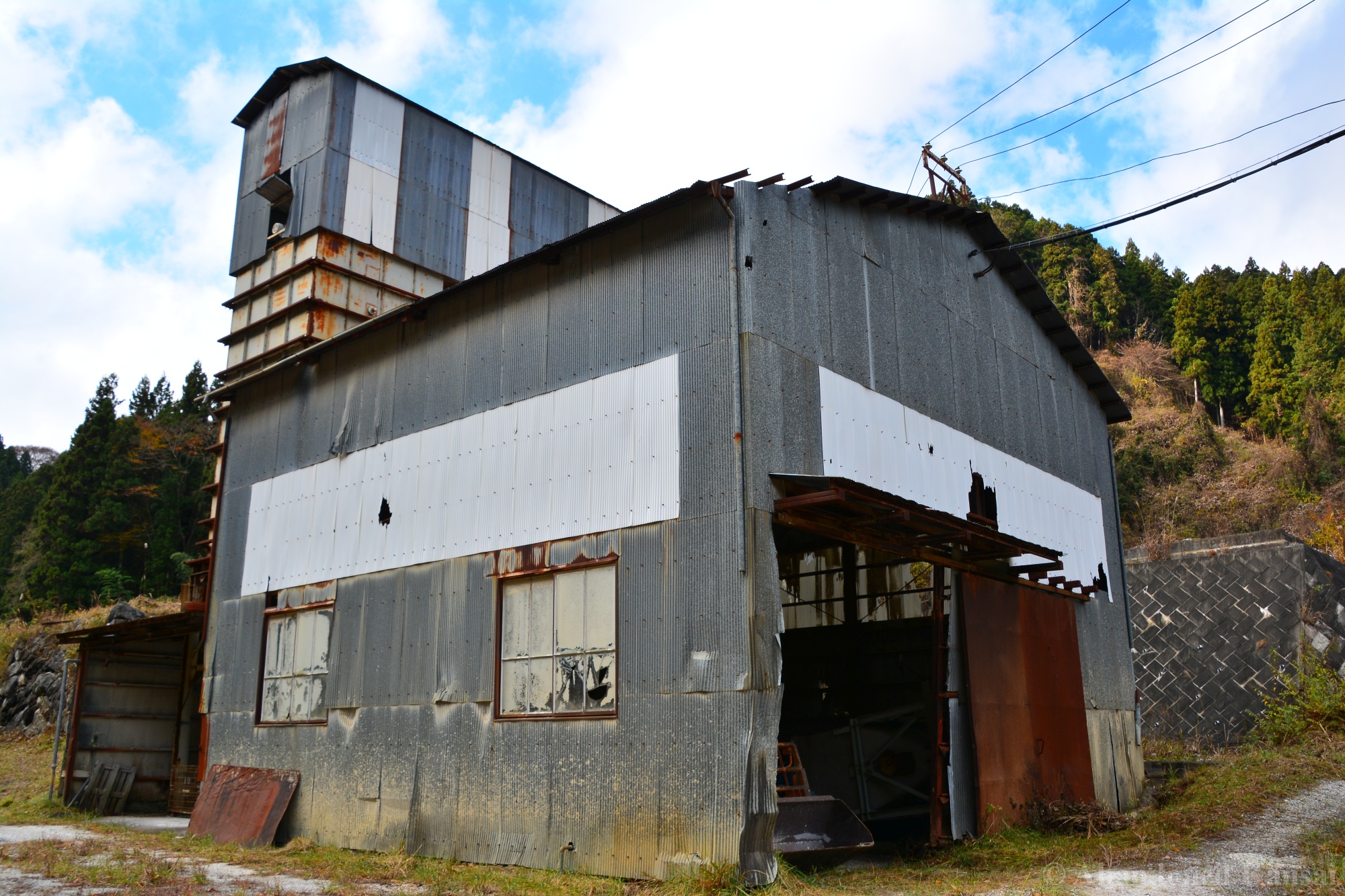 The Tohoku Quarry was a beautiful exploration, but not a very eventful one – we drove up to the place and there were no fences or security, just a rope to prevent vehicles from entering (and dumping large amounts of trash, which is a real problem in the Japanese countryside!). The power supply equipment was protected by a large metal cage, nearby were a couple of huts used for storage and as an office / large break room. A large stone processing plant that was able to load trucks was built into the slope; the quarry itself was at the upper end, of course. It was a beautiful sunny autumn day, and we were exploring mostly outdoors, out of sight and out of sound of civilization – exactly my kind of location. Nothing to worry about, just exploring a naturally decaying industrial site. The place kind of reminded me of the *Takarazuka Macadam Industrial Plant* from almost 10 years ago – a classic site that is not accessible anymore, unfortunately.