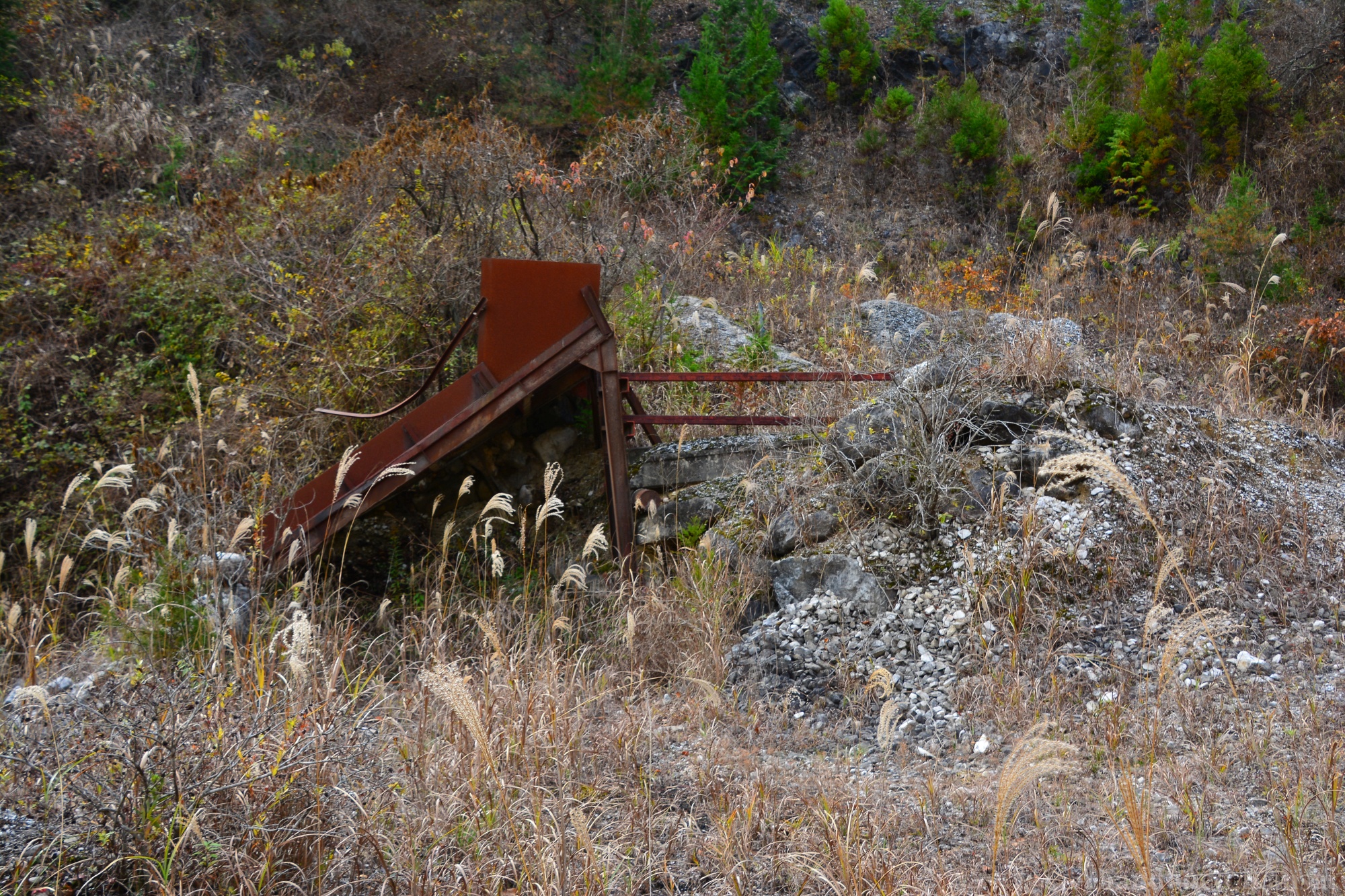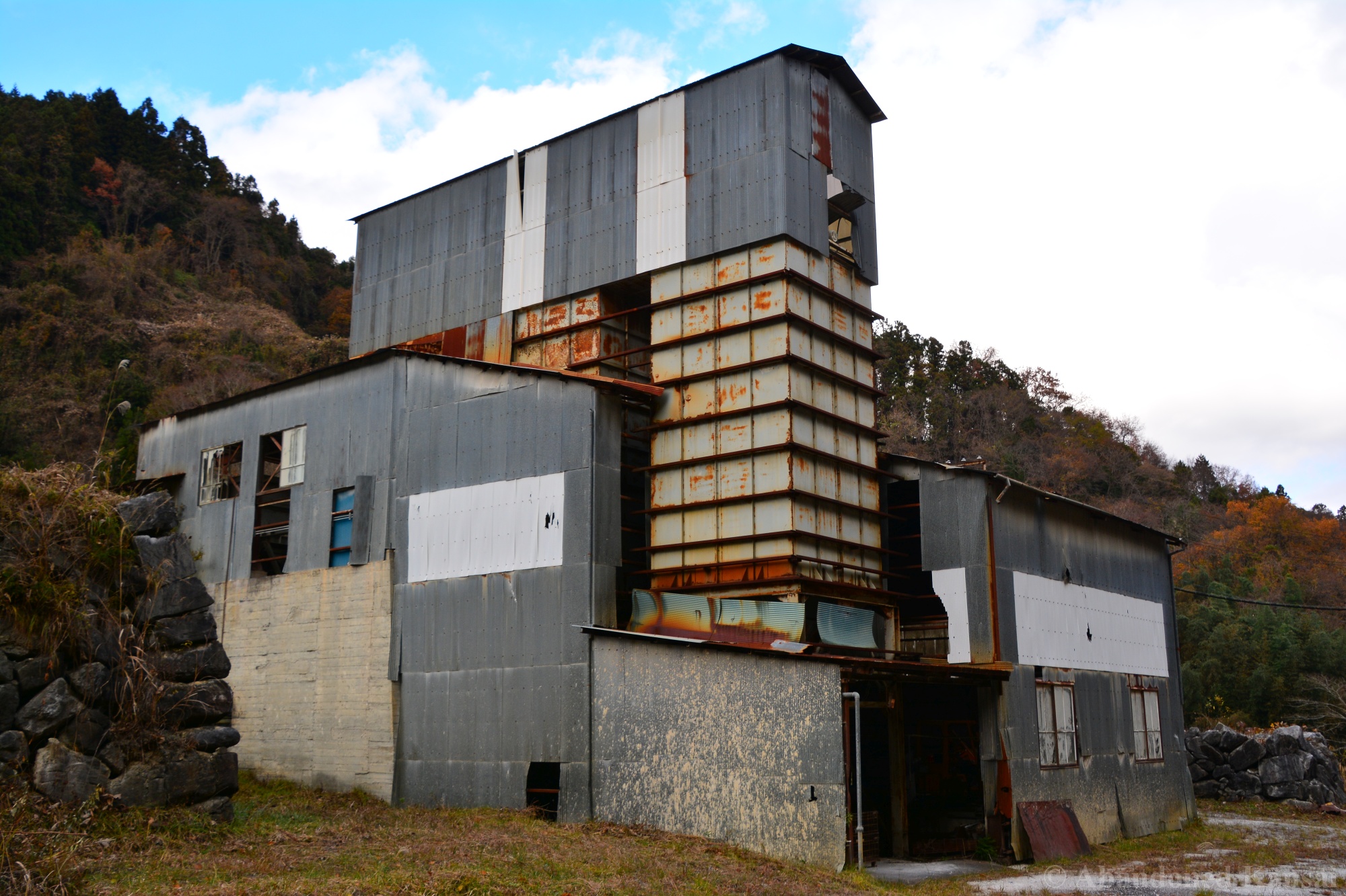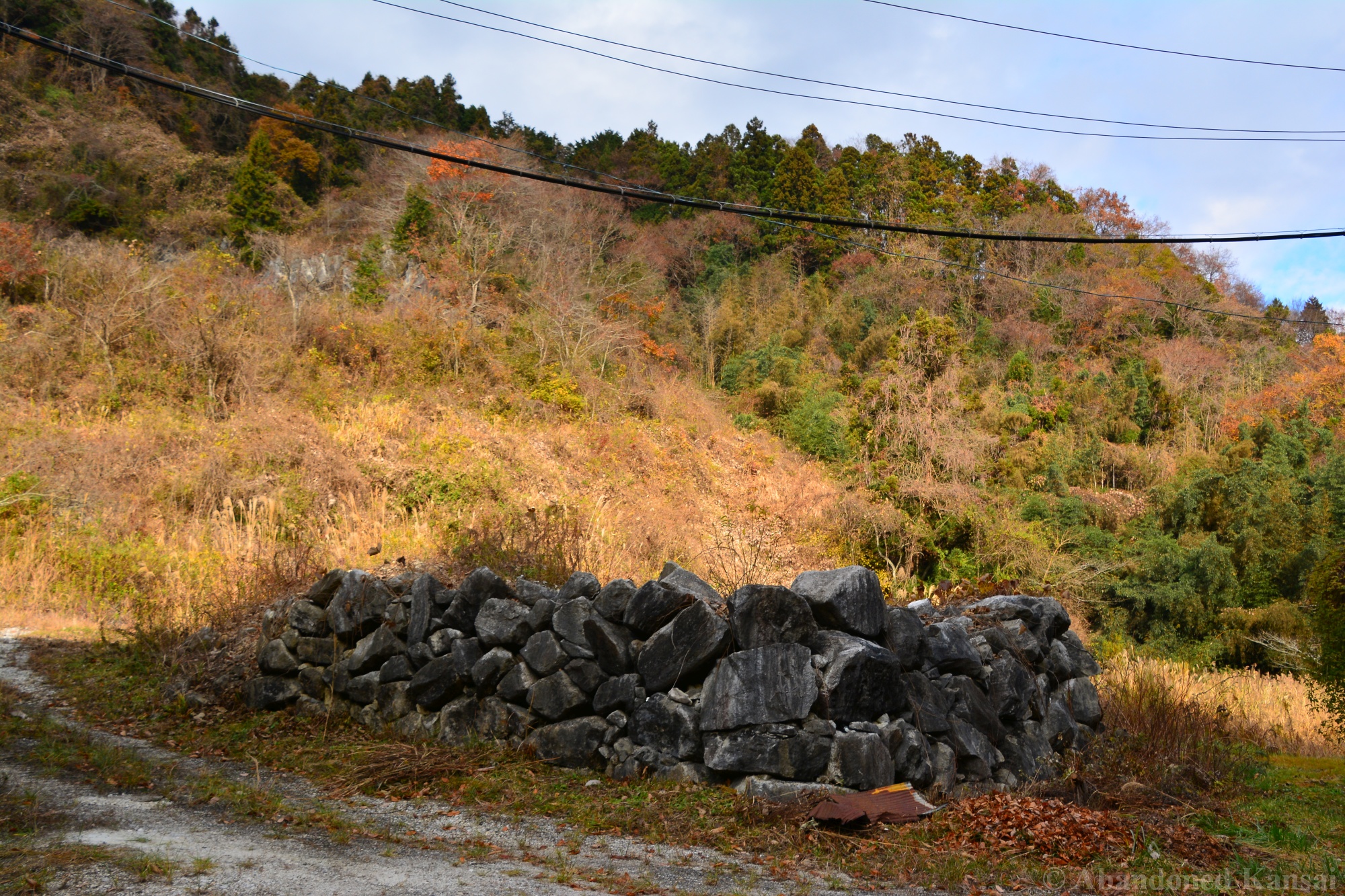 The Tohoku Quarry was a beautiful exploration, but not a very eventful one – we drove up to the place and there were no fences or security, just a rope to prevent vehicles from entering (and dumping large amounts of trash, which is a real problem in the Japanese countryside!). The power supply equipment was protected by a large metal cage, nearby were a couple of huts used for storage and as an office / large break room. A large stone processing plant that was able to load trucks was built into the slope; the quarry itself was at the upper end, of course. It was a beautiful sunny autumn day, and we were exploring mostly outdoors, out of sight and out of sound of civilization – exactly my kind of location. Nothing to worry about, just exploring a naturally decaying industrial site. The place kind of reminded me of the *Takarazuka Macadam Industrial Plant* from almost 10 years ago – a classic site that is not accessible anymore, unfortunately.