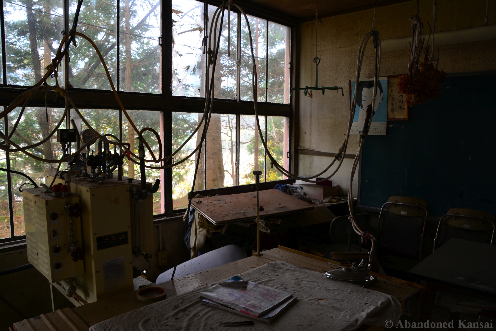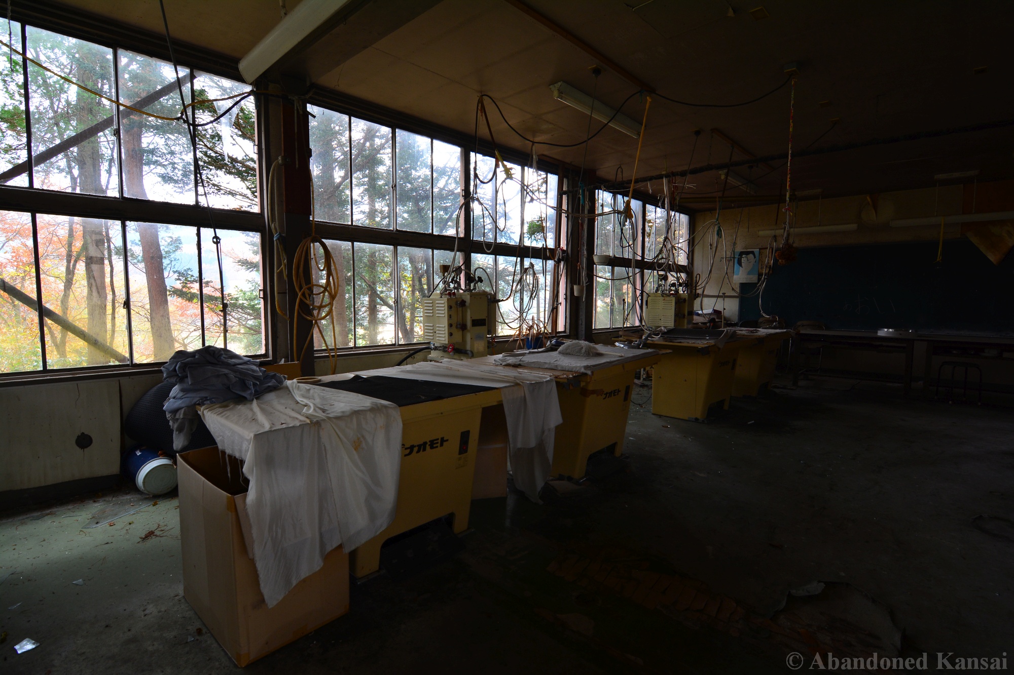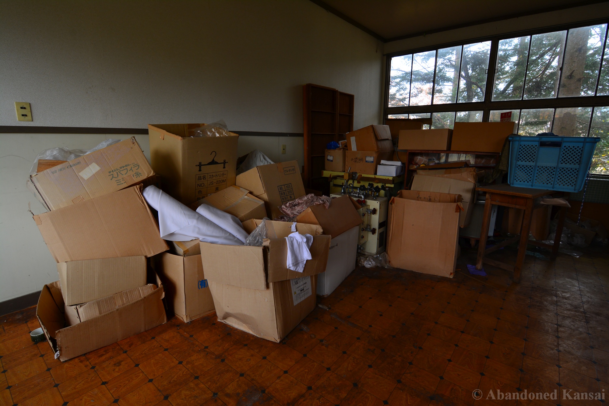 The abandoned Clothing School dates back to the year 1875 and was an elementary school until it’s closure in the early 1980s. During its more than 100 year long history the building was expanded and remodeled several times, making it kind of a hybrid between a wood only and a modern school. After the school was closed it had a second life as an apparel company, which made this exploration so exciting – especially since I explored this place many moons ago and didn’t know much about it at the time. Entering through the back the building looked like a regular abandoned school at first. Then some cardboard boxes with fabric and plastic wrapped shirts caught my eyes. The next room was filled with industrial ironing machines by Naomoto – and down the hallway were several rooms that you usually don’t find in an abandoned school, including a bed room, a living room, a conference room or maybe a room for sales people, a head office for the boss and break room for staff featuring a female mannequin looking out of the window, scaring the living hell out of people not expecting to see it / her there…