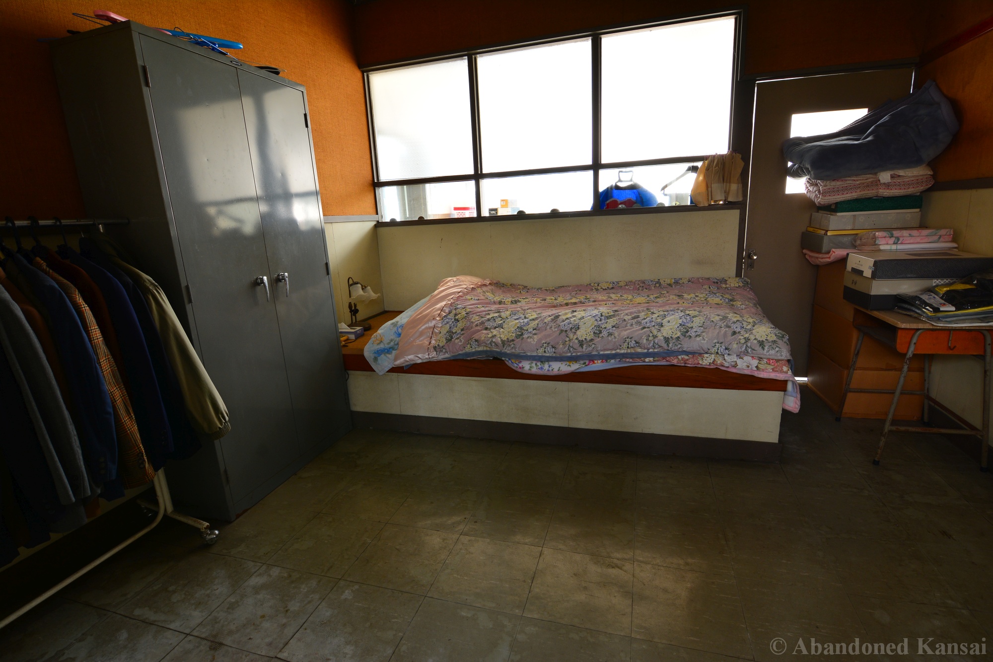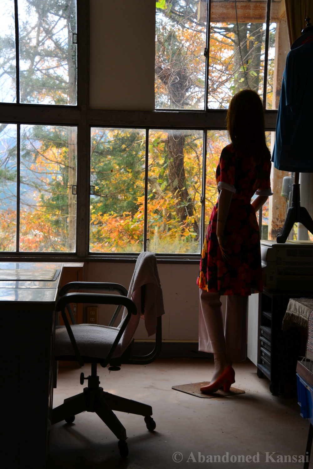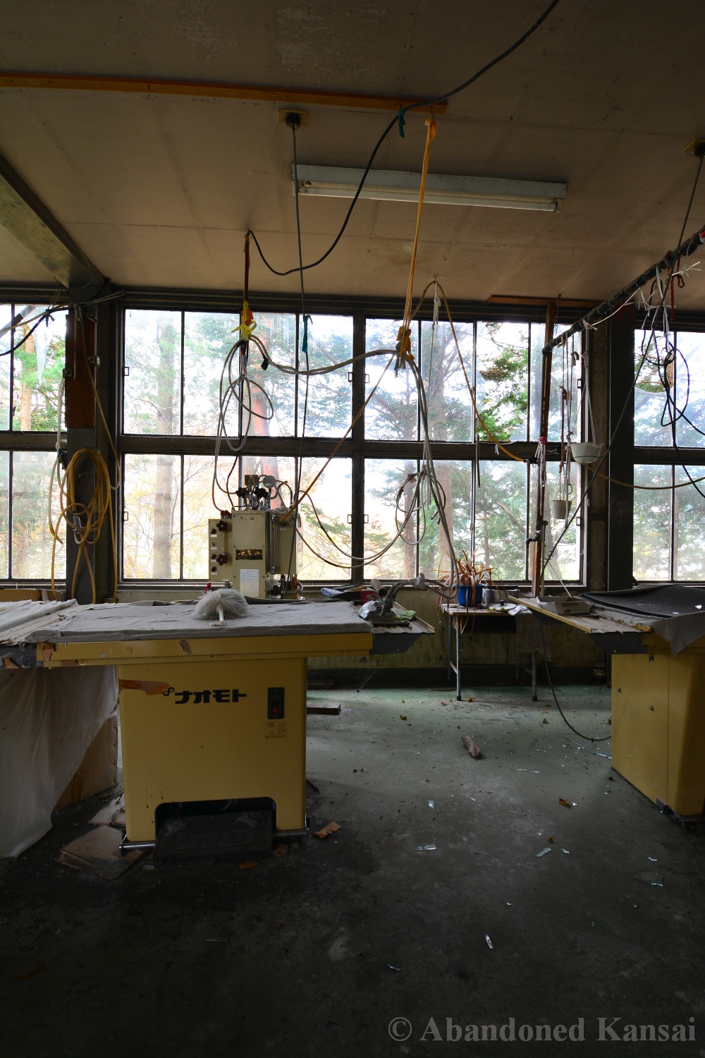 The abandoned Clothing School dates back to the year 1875 and was an elementary school until it’s closure in the early 1980s. During its more than 100 year long history the building was expanded and remodeled several times, making it kind of a hybrid between a wood only and a modern school. After the school was closed it had a second life as an apparel company, which made this exploration so exciting – especially since I explored this place many moons ago and didn’t know much about it at the time. Entering through the back the building looked like a regular abandoned school at first. Then some cardboard boxes with fabric and plastic wrapped shirts caught my eyes. The next room was filled with industrial ironing machines by Naomoto – and down the hallway were several rooms that you usually don’t find in an abandoned school, including a bed room, a living room, a conference room or maybe a room for sales people, a head office for the boss and break room for staff featuring a female mannequin looking out of the window, scaring the living hell out of people not expecting to see it / her there…